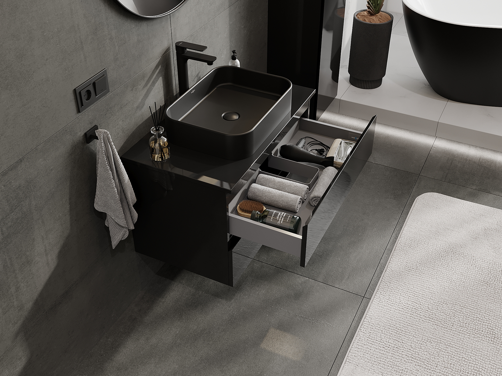 Kiinteiden materiaalien, tarkan työn ja nykyaikaisten teknologisten ratkaisujen ansiosta tuote tarjoaa käyttömukavuutta, kestävyyttä kosteutta ja lämpötilan muutoksia vastaan sekä elegantin ulkonäön, joka sopii erilaisiin kylpyhuonetyyleihin.