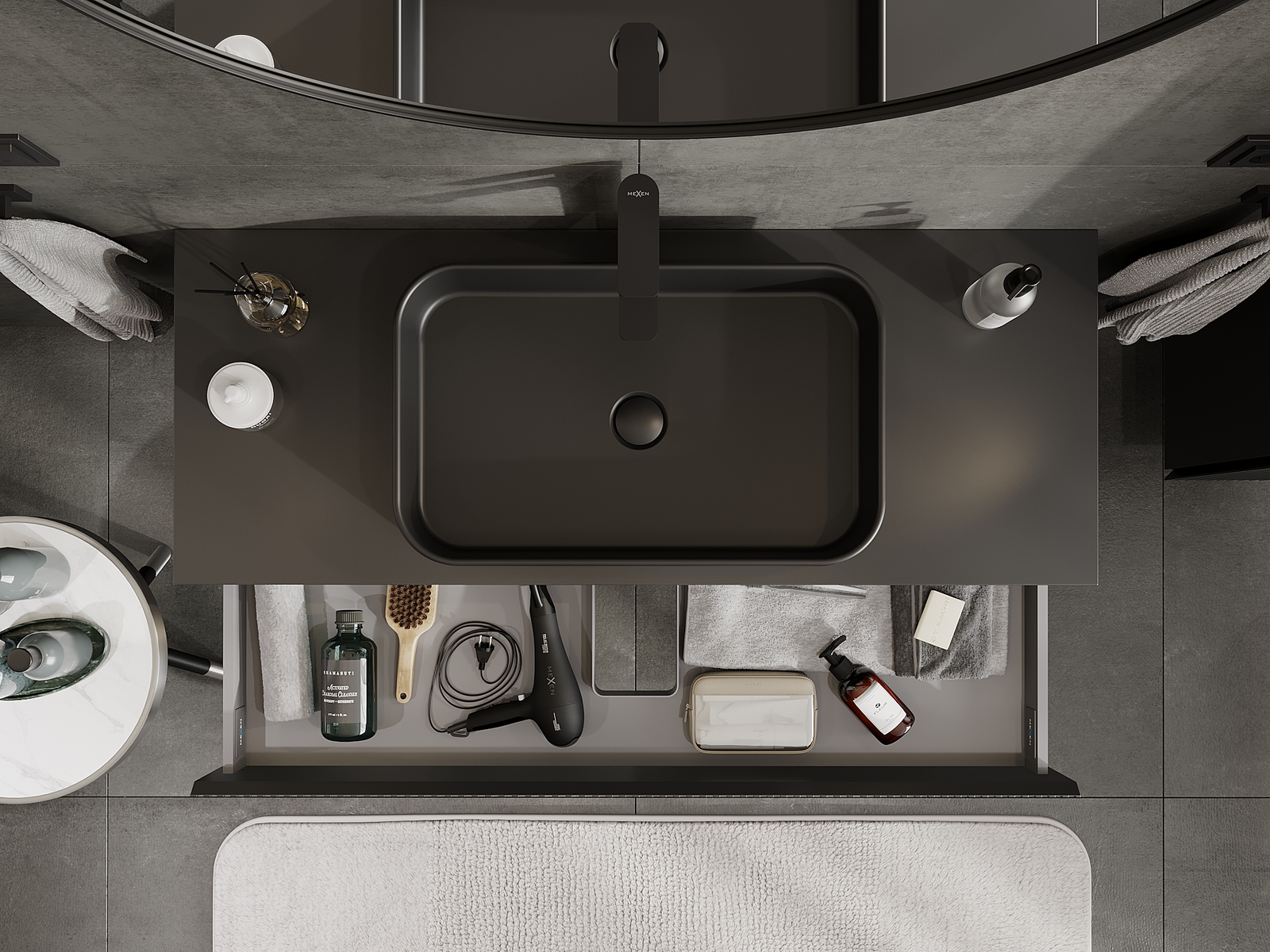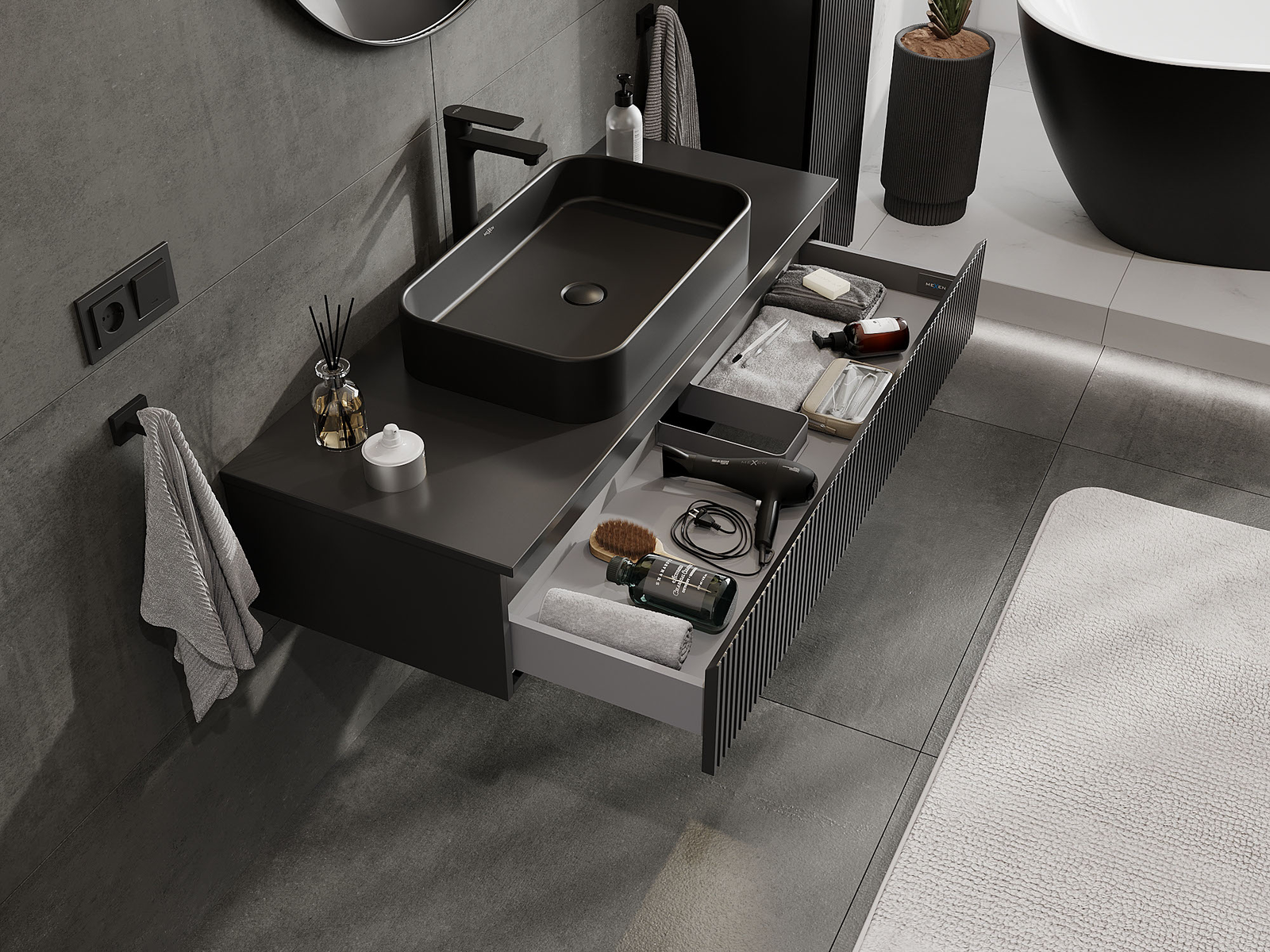 Mexen Rivel kylpyhuoneen pesualtaan alakaappi 120 cm, 1 laatikko, uritettu, musta matta - 91A20-12023-1-BF71