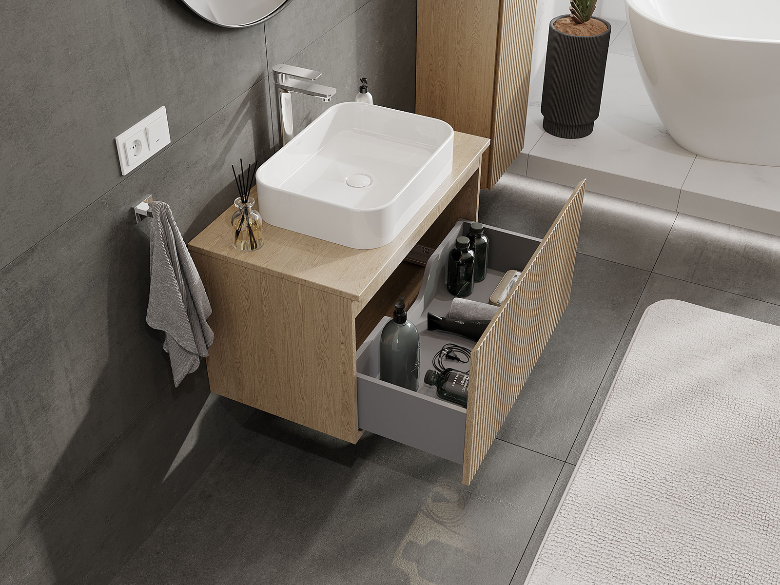 Kiinteiden materiaalien, tarkan työn ja nykyaikaisten teknologisten ratkaisujen ansiosta tuote tarjoaa käyttömukavuutta, kestävyyttä kosteutta ja lämpötilan muutoksia vastaan sekä elegantin ulkonäön, joka sopii erilaisiin kylpyhuonetyyleihin.