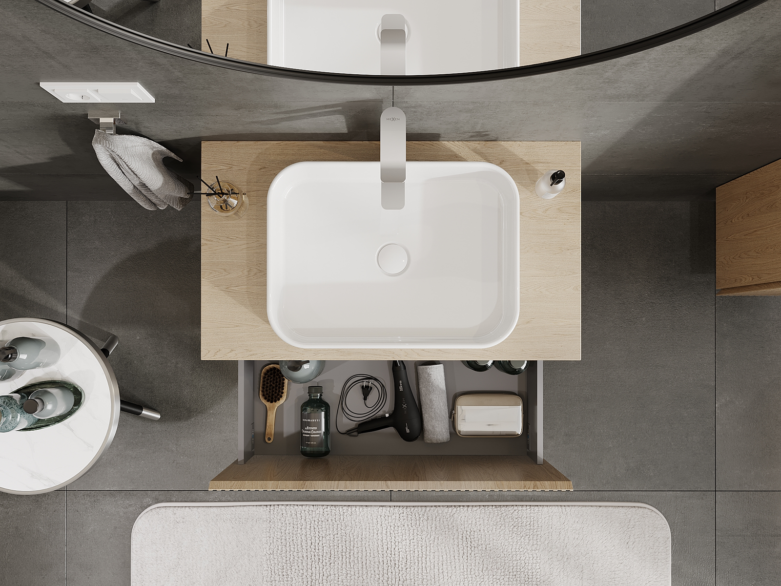 Laatikon leikkaus on suunniteltu siten, että se mahtuu vetolaitteeseen, joka on välttämätön pesuallasasennuksissa. Tämän ansiosta huonekalu voidaan asentaa täysin toimivasti, luopumatta laatikon tilasta asennusten hyväksi.