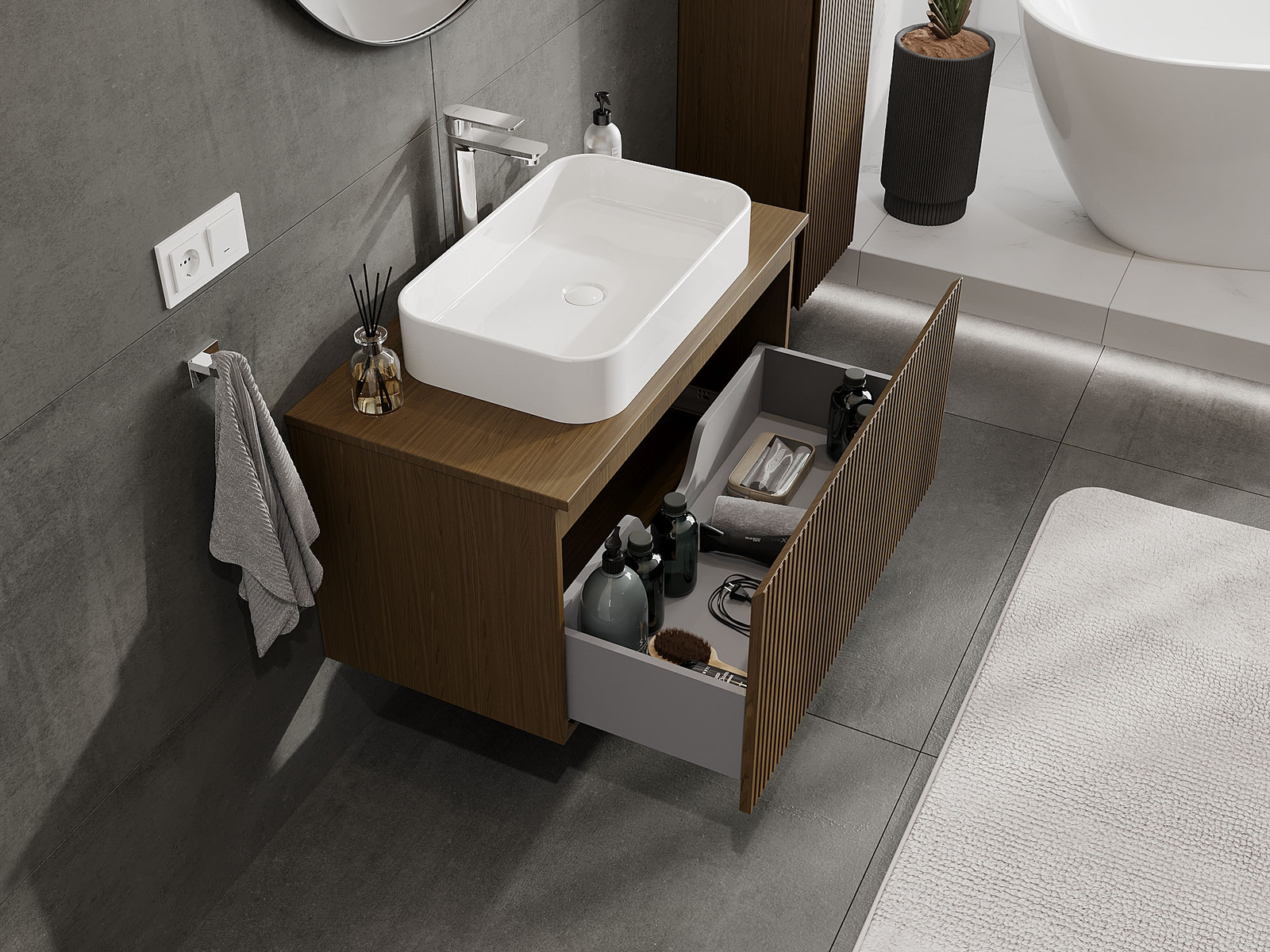 Kiinteiden materiaalien, tarkan työn ja nykyaikaisten teknologisten ratkaisujen ansiosta tuote tarjoaa käyttömukavuutta, kestävyyttä kosteutta ja lämpötilan muutoksia vastaan sekä elegantin ulkonäön, joka sopii erilaisiin kylpyhuonetyyleihin.