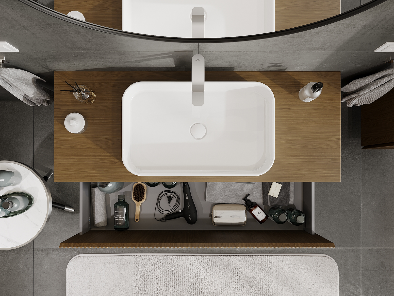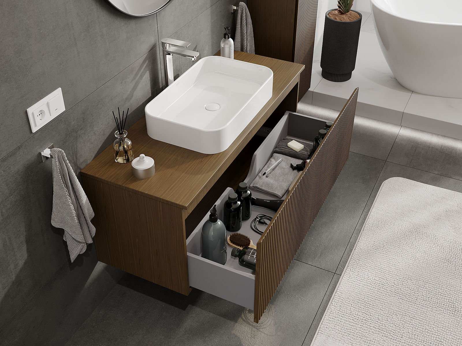 Kiinteiden materiaalien, tarkan työn ja nykyaikaisten teknologisten ratkaisujen ansiosta tuote tarjoaa käyttömukavuutta, kestävyyttä kosteutta ja lämpötilan muutoksia vastaan sekä elegantin ulkonäön, joka sopii erilaisiin kylpyhuonetyyleihin.
