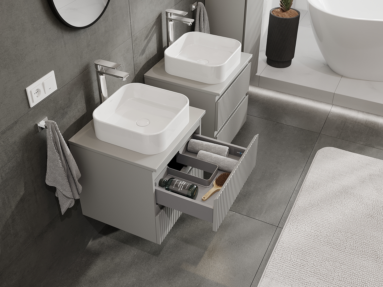 Modulaariset kylpyhuonekalusteemme voidaan yhdistää eri väriyhdistelminä, mikä mahdollistaa täydellisen personoinnin. Voit valita sekä ulkonäön että yksittäisten elementtien toiminnot, mikä mahdollistaa huonekalujen mukauttamisen omien tyylillisten ja käyttöön liittyvien mieltymysten mukaan.
