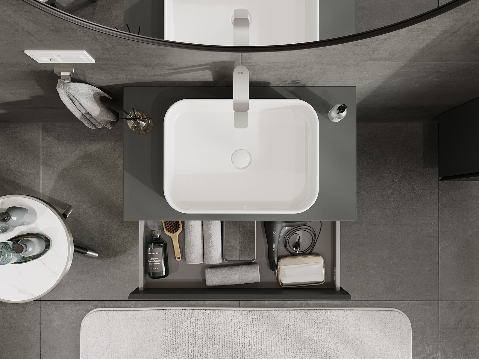 Laatikon leikkaus on suunniteltu siten, että se mahtuu vetolaitteeseen, joka on välttämätön pesuallasasennuksissa. Tämän ansiosta huonekalu voidaan asentaa täysin toimivasti, luopumatta laatikon tilasta asennusten hyväksi.