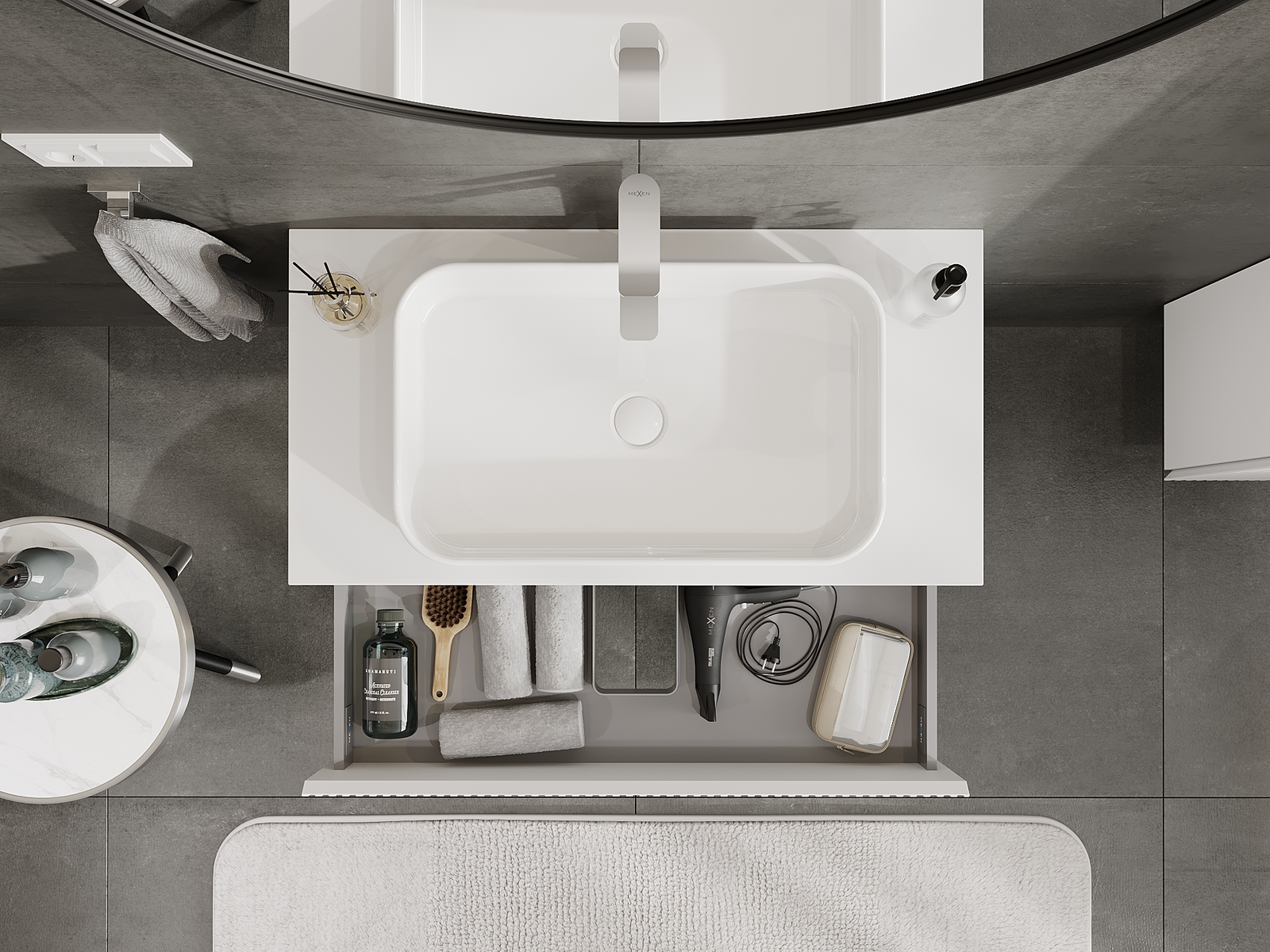 Laatikon leikkaus on suunniteltu siten, että se mahtuu vetolaitteeseen, joka on välttämätön pesuallasasennuksissa. Tämän ansiosta huonekalu voidaan asentaa täysin toimivasti, luopumatta laatikon tilasta asennusten hyväksi.