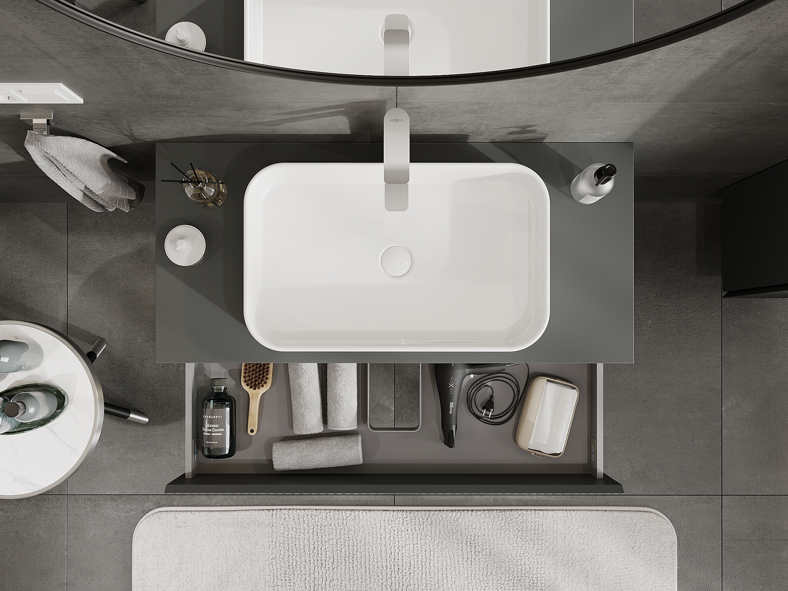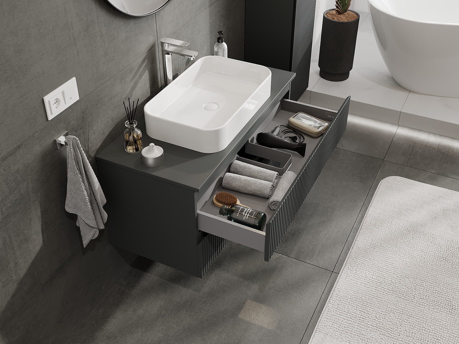 Kiinteiden materiaalien, tarkan työn ja nykyaikaisten teknologisten ratkaisujen ansiosta tuote tarjoaa käyttömukavuutta, kestävyyttä kosteutta ja lämpötilan muutoksia vastaan sekä elegantin ulkonäön, joka sopii erilaisiin kylpyhuonetyyleihin.