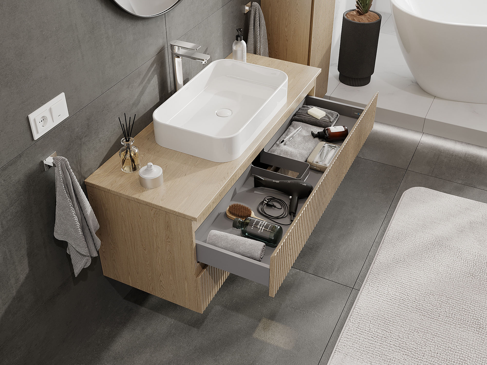 Kiinteiden materiaalien, tarkan työn ja nykyaikaisten teknologisten ratkaisujen ansiosta tuote tarjoaa käyttömukavuutta, kestävyyttä kosteutta ja lämpötilan muutoksia vastaan sekä elegantin ulkonäön, joka sopii erilaisiin kylpyhuonetyyleihin.