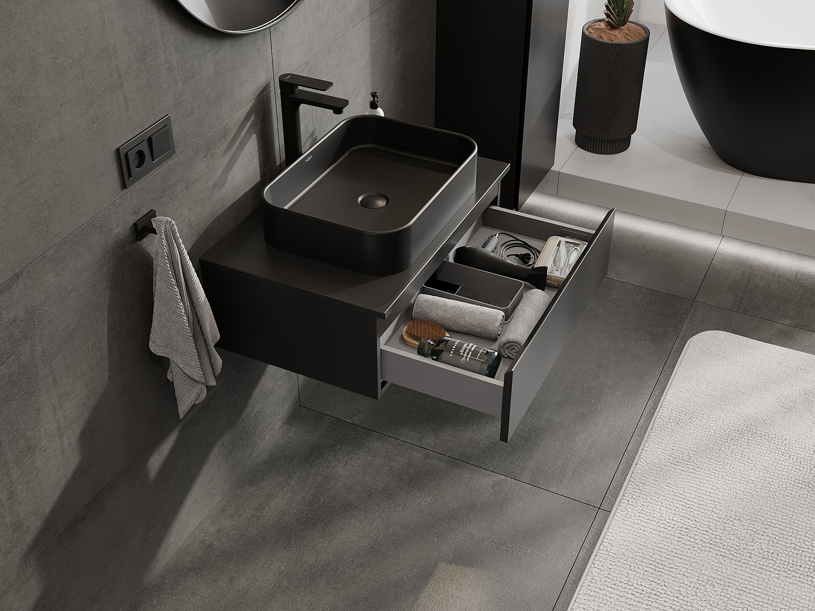 Mexen Orio musta matta pesualtaan alla 70 cm oleva kylpyhuonekaappi, jossa on pöytälevy, 1 laatikko - 91A10-07023-1-BFC71