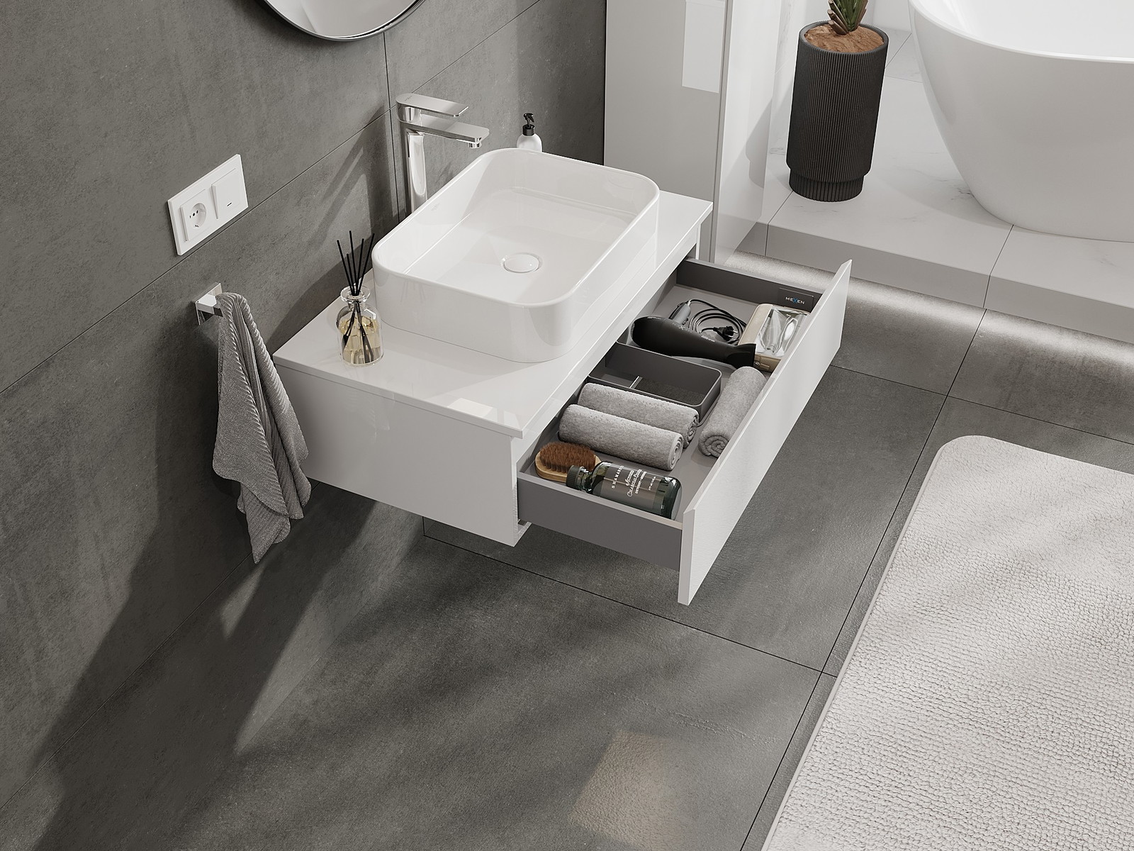 Kiinteiden materiaalien, tarkan työn ja nykyaikaisten teknologisten ratkaisujen ansiosta tuote tarjoaa käyttömukavuutta, kestävyyttä kosteutta ja lämpötilan muutoksia vastaan sekä elegantin ulkonäön, joka sopii erilaisiin kylpyhuonetyyleihin.