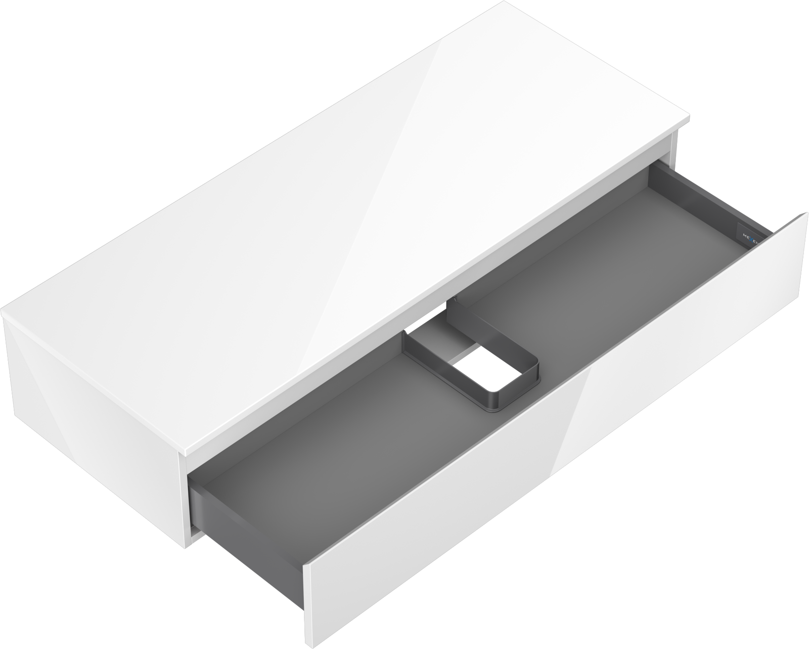 Laatikon leikkaus on suunniteltu siten, että se mahtuu vetolaitteeseen, joka on välttämätön pesuallasasennuksissa. Tämän ansiosta huonekalu voidaan asentaa täysin toimivasti, luopumatta laatikon tilasta asennusten hyväksi.