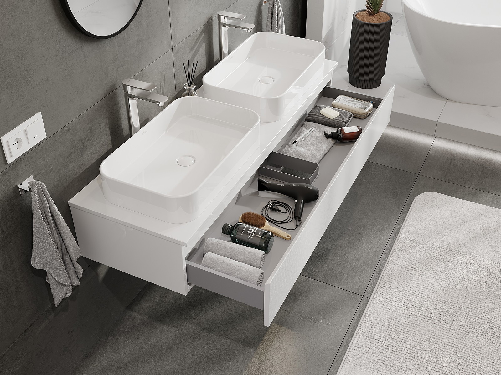 Modulaariset kylpyhuonekalusteemme voidaan yhdistää eri väriyhdistelminä, mikä mahdollistaa täydellisen personoinnin. Voit valita sekä ulkonäön että yksittäisten elementtien toiminnot, mikä mahdollistaa huonekalujen mukauttamisen omien tyylillisten ja käyttöön liittyvien mieltymysten mukaan.