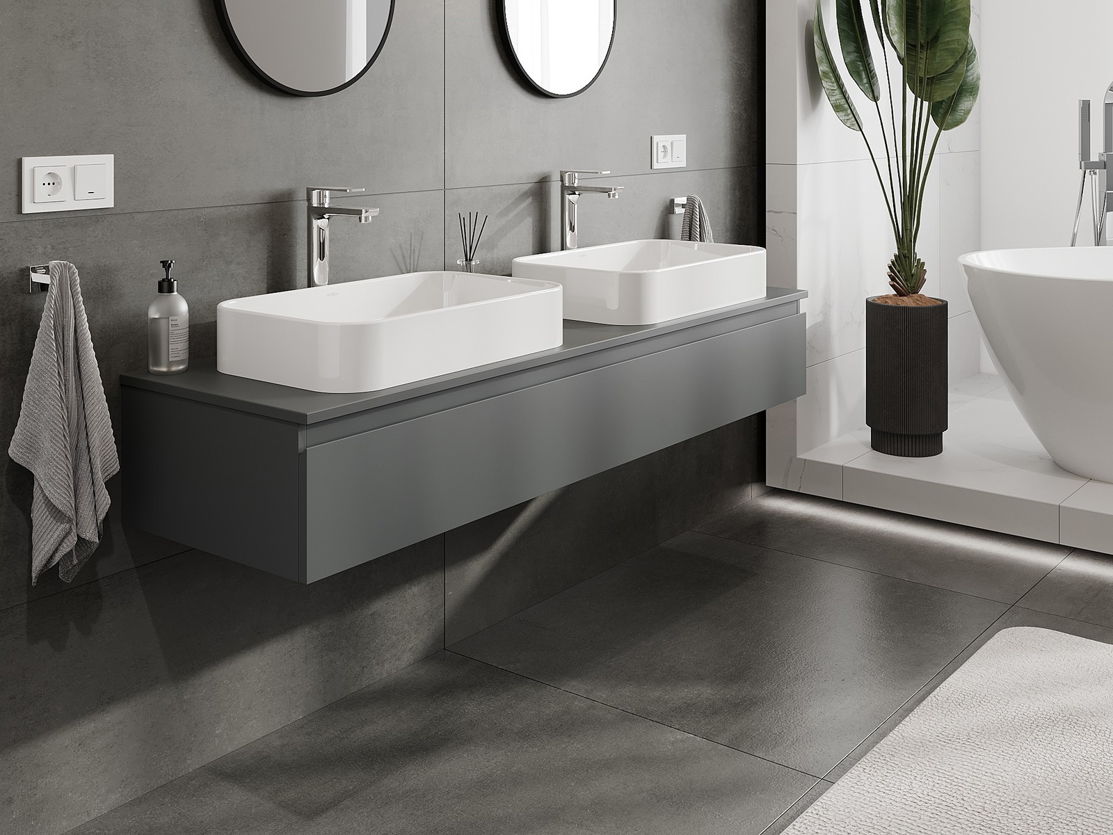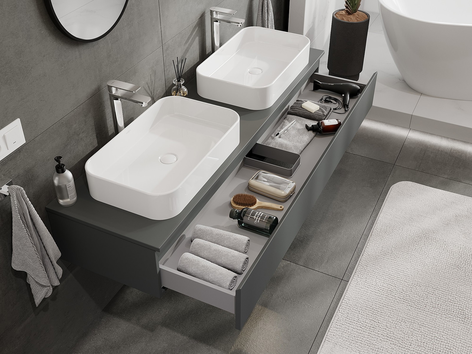 Modulaariset kylpyhuonekalusteemme voidaan yhdistää eri väriyhdistelminä, mikä mahdollistaa täydellisen personoinnin. Voit valita sekä ulkonäön että yksittäisten elementtien toiminnot, mikä mahdollistaa huonekalujen mukauttamisen omien tyylillisten ja käyttöön liittyvien mieltymysten mukaan.