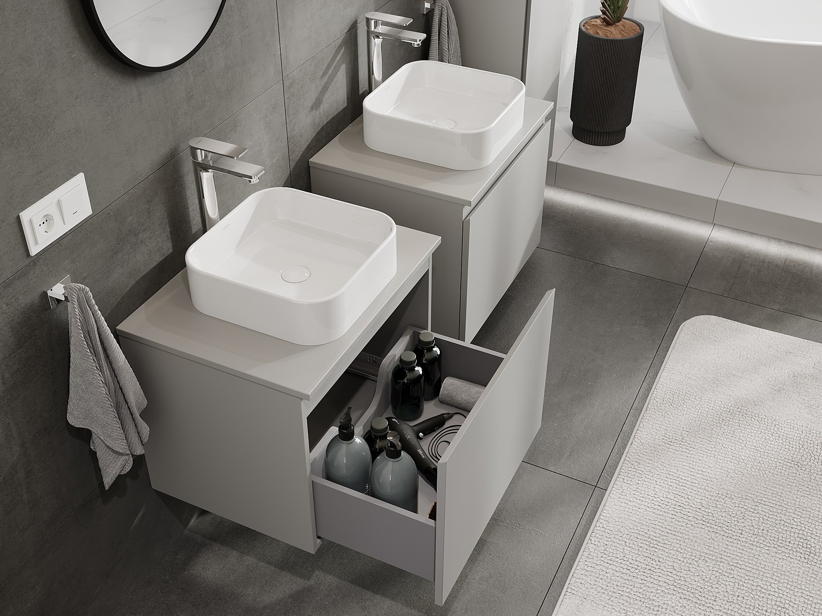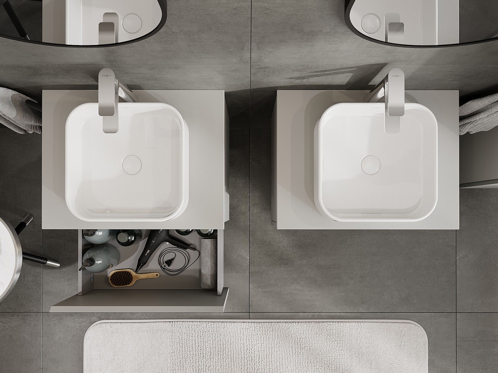 Modulaariset kylpyhuonekalusteemme voidaan yhdistää eri väriyhdistelminä, mikä mahdollistaa täydellisen personoinnin. Voit valita sekä ulkonäön että yksittäisten elementtien toiminnot, mikä mahdollistaa huonekalujen mukauttamisen omien tyylillisten ja käyttöön liittyvien mieltymysten mukaan.