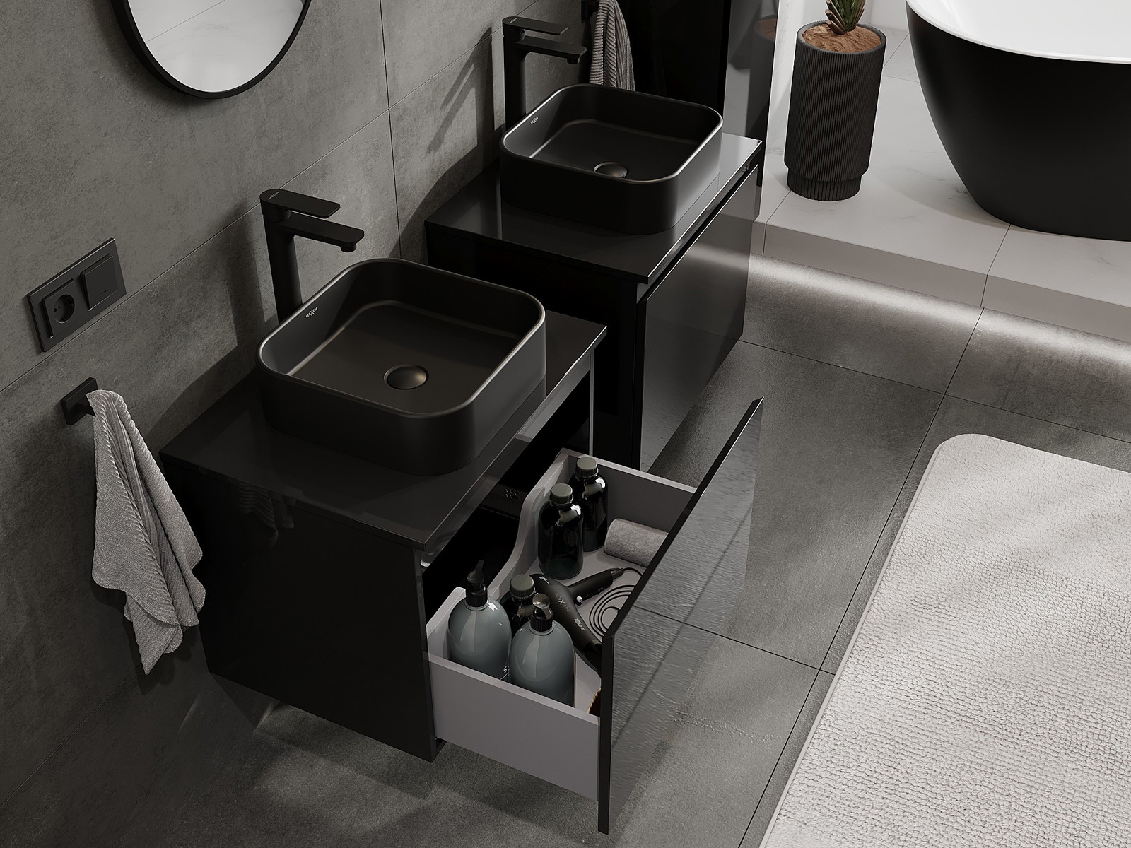 Modulaariset kylpyhuonekalusteemme voidaan yhdistää eri väriyhdistelminä, mikä mahdollistaa täydellisen personoinnin. Voit valita sekä ulkonäön että yksittäisten elementtien toiminnot, mikä mahdollistaa huonekalujen mukauttamisen omien tyylillisten ja käyttöön liittyvien mieltymysten mukaan.