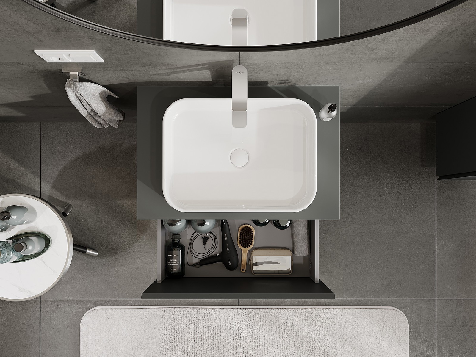 Laatikon leikkaus on suunniteltu siten, että se mahtuu vetolaitteeseen, joka on välttämätön pesuallasasennuksissa. Tämän ansiosta huonekalu voidaan asentaa täysin toimivasti, luopumatta laatikon tilasta asennusten hyväksi.
