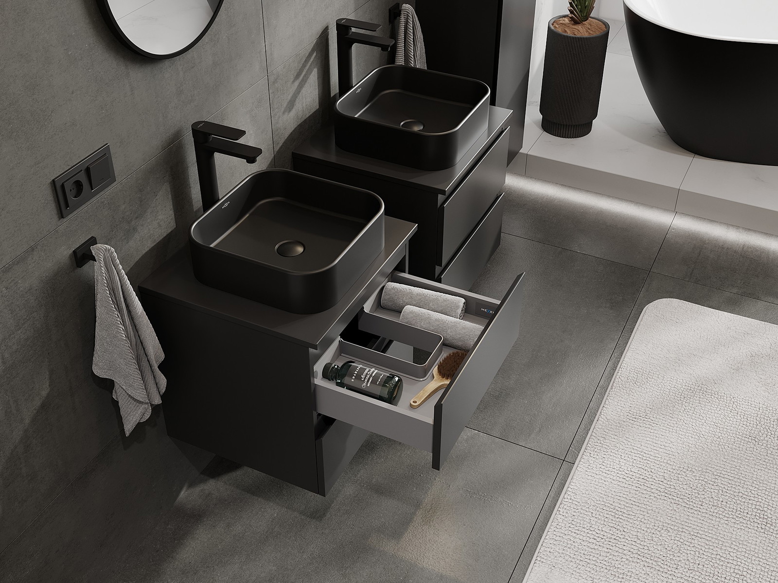 Modulaariset kylpyhuonekalusteemme voidaan yhdistää eri väriyhdistelminä, mikä mahdollistaa täydellisen personoinnin. Voit valita sekä ulkonäön että yksittäisten elementtien toiminnot, mikä mahdollistaa huonekalujen mukauttamisen omien tyylillisten ja käyttöön liittyvien mieltymysten mukaan.