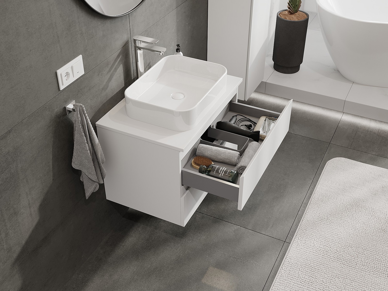 Modulaariset kylpyhuonekalusteemme voidaan yhdistää eri väriyhdistelminä, mikä mahdollistaa täydellisen personoinnin. Voit valita sekä ulkonäön että yksittäisten elementtien toiminnot, mikä mahdollistaa huonekalujen mukauttamisen omien tyylillisten ja käyttöön liittyvien mieltymysten mukaan.