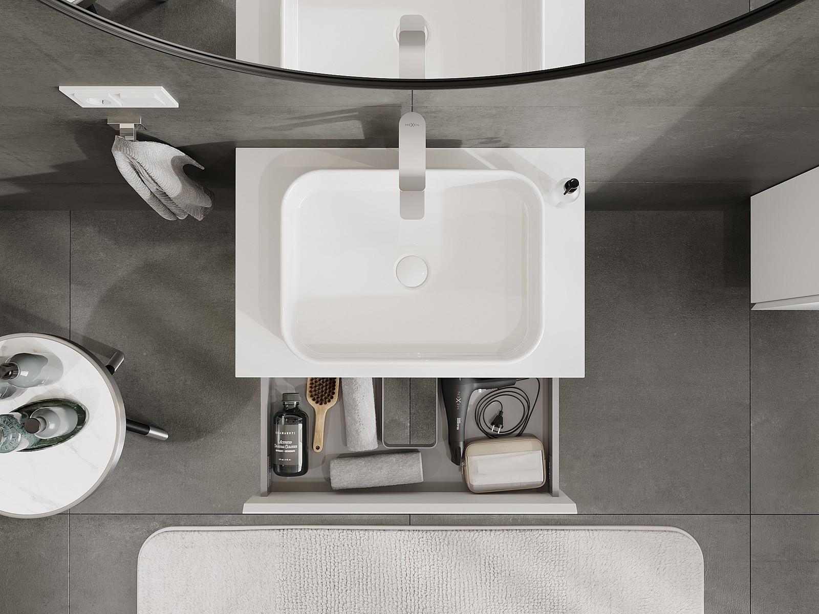 Laatikon leikkaus on suunniteltu siten, että se mahtuu vetolaitteeseen, joka on välttämätön pesuallasasennuksissa. Tämän ansiosta huonekalu voidaan asentaa täysin toimivasti, luopumatta laatikon tilasta asennusten hyväksi.