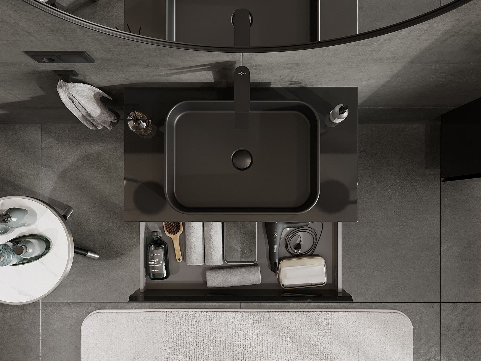 Laatikon leikkaus on suunniteltu siten, että se mahtuu vetolaitteeseen, joka on välttämätön pesuallasasennuksissa. Tämän ansiosta huonekalu voidaan asentaa täysin toimivasti, luopumatta laatikon tilasta asennusten hyväksi.
