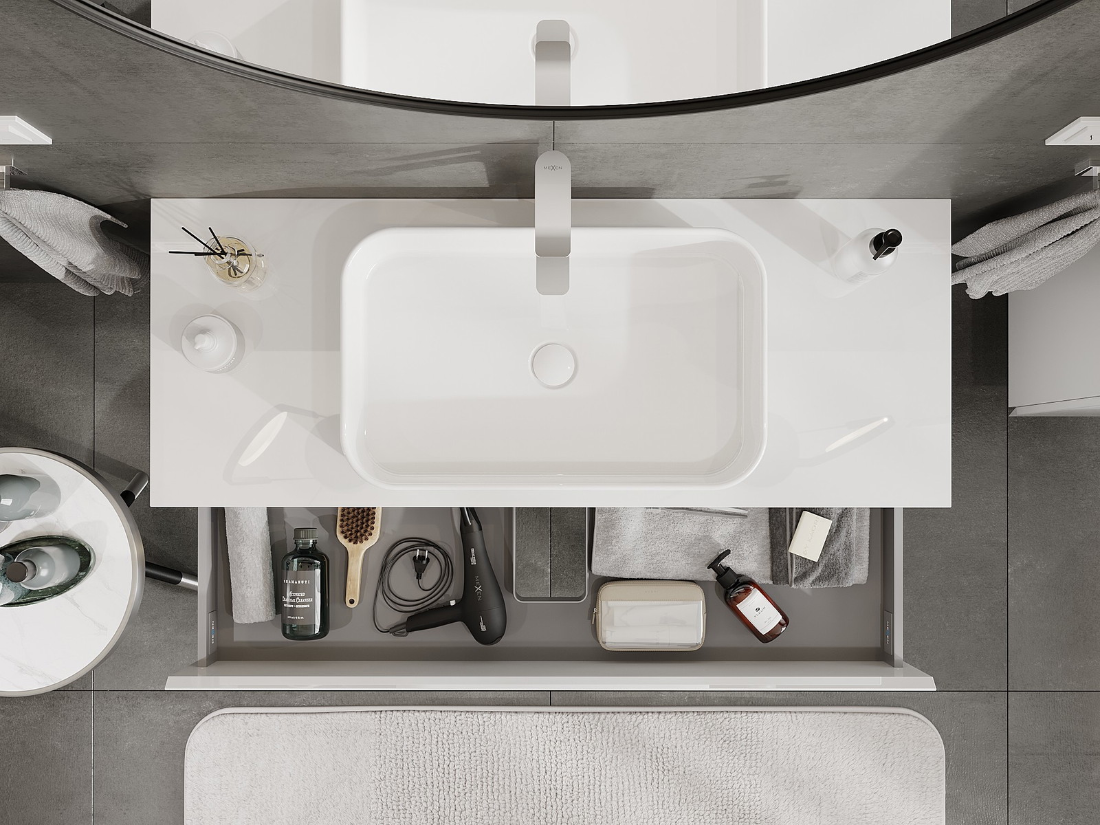 Modulaariset kylpyhuonekalusteemme voidaan yhdistää eri väriyhdistelminä, mikä mahdollistaa täydellisen personoinnin. Voit valita sekä ulkonäön että yksittäisten elementtien toiminnot, mikä mahdollistaa huonekalujen mukauttamisen omien tyylillisten ja käyttöön liittyvien mieltymysten mukaan.