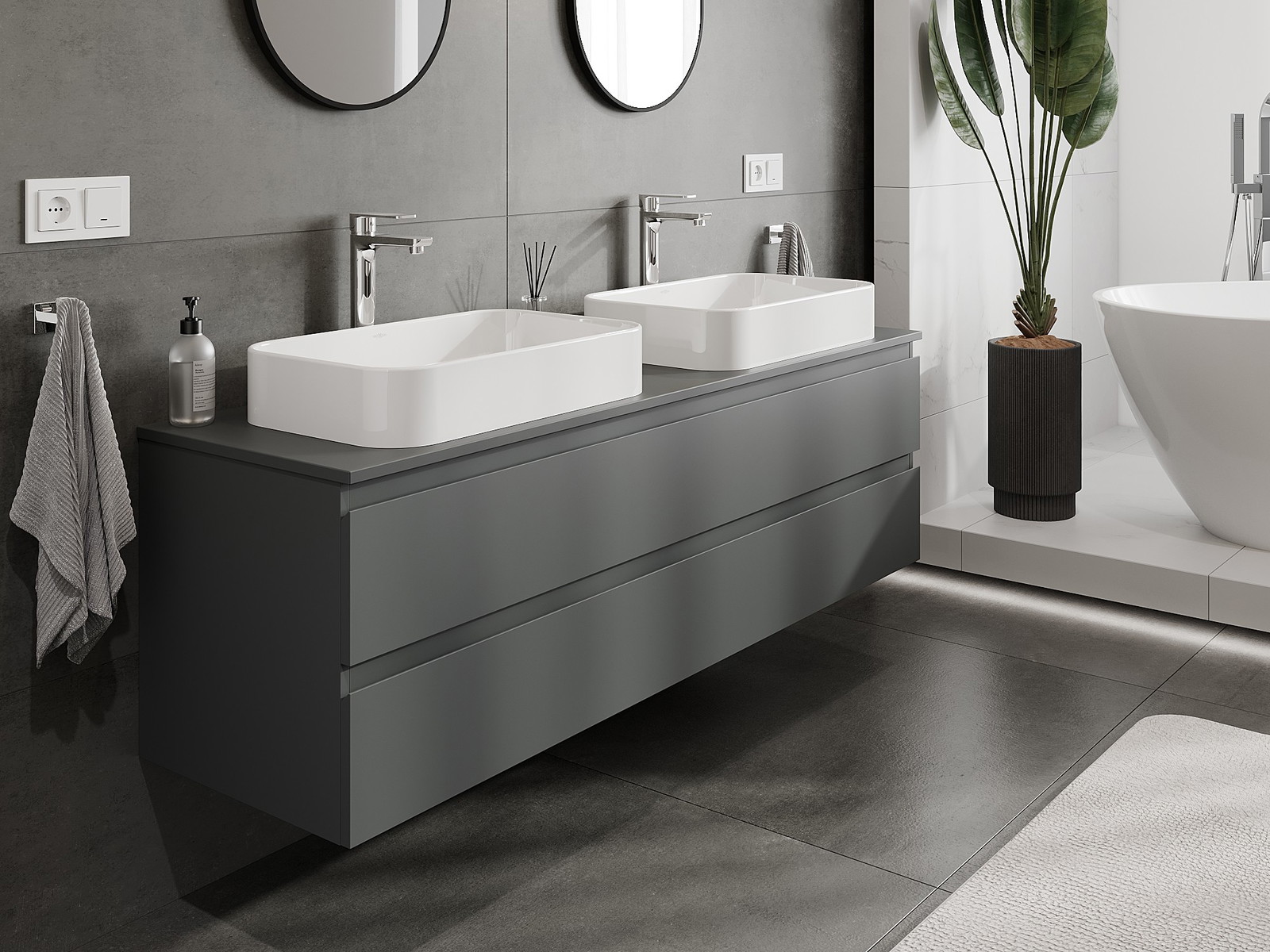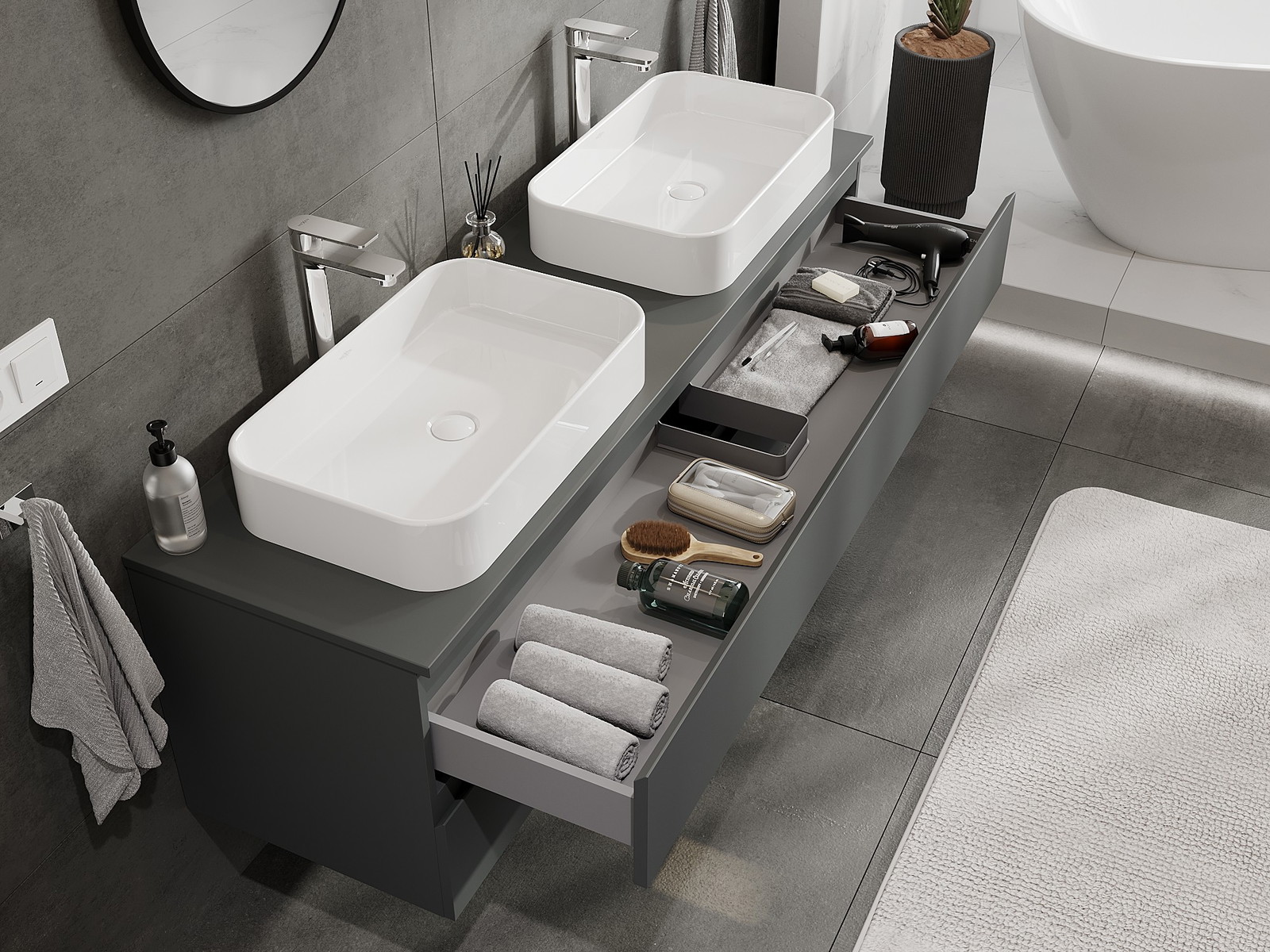Modulaariset kylpyhuonekalusteemme voidaan yhdistää eri väriyhdistelminä, mikä mahdollistaa täydellisen personoinnin. Voit valita sekä ulkonäön että yksittäisten elementtien toiminnot, mikä mahdollistaa huonekalujen mukauttamisen omien tyylillisten ja käyttöön liittyvien mieltymysten mukaan.