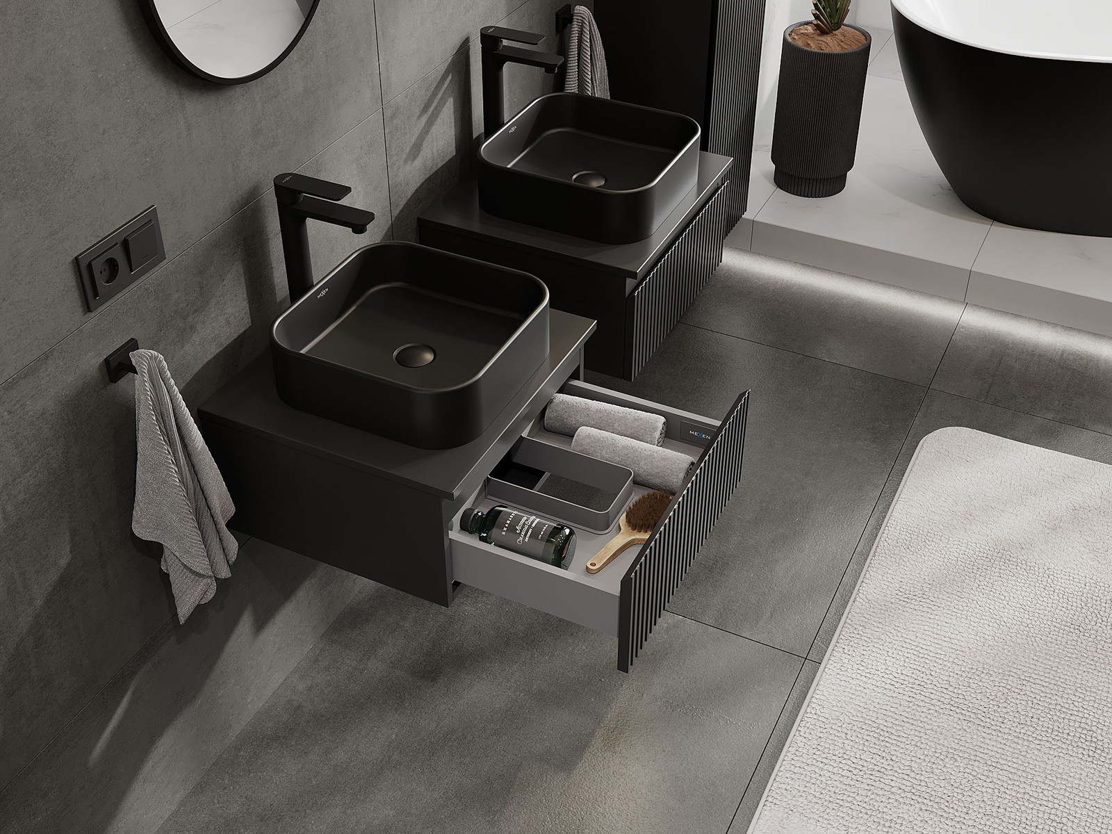 Mexen Rivel 50 cm kylpyhuoneen alakaappi työtasolla, 1 laatikko, uritettu, musta matta - 91A20-05023-1-BFC71