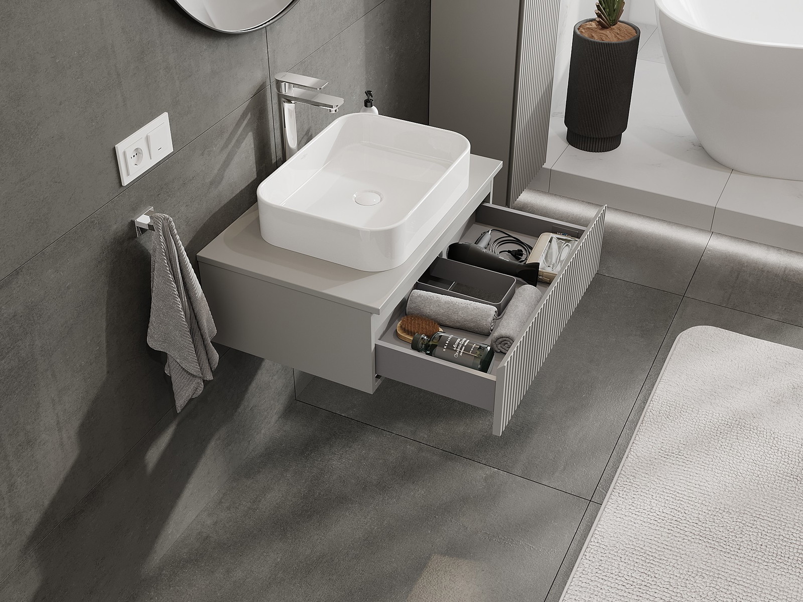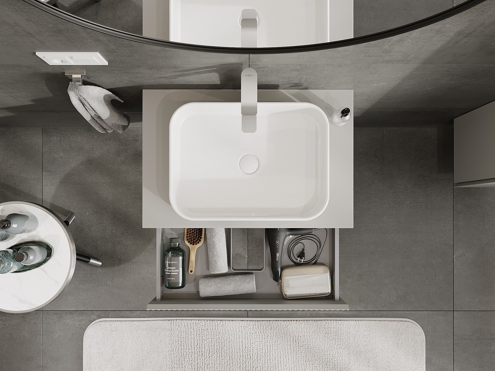 Mexen Rivel 70 cm:n pesualtaan alapuolinen kylpyhuonekaappi työtasolla, 1 laatikko, viilutettu, harmaa matta
