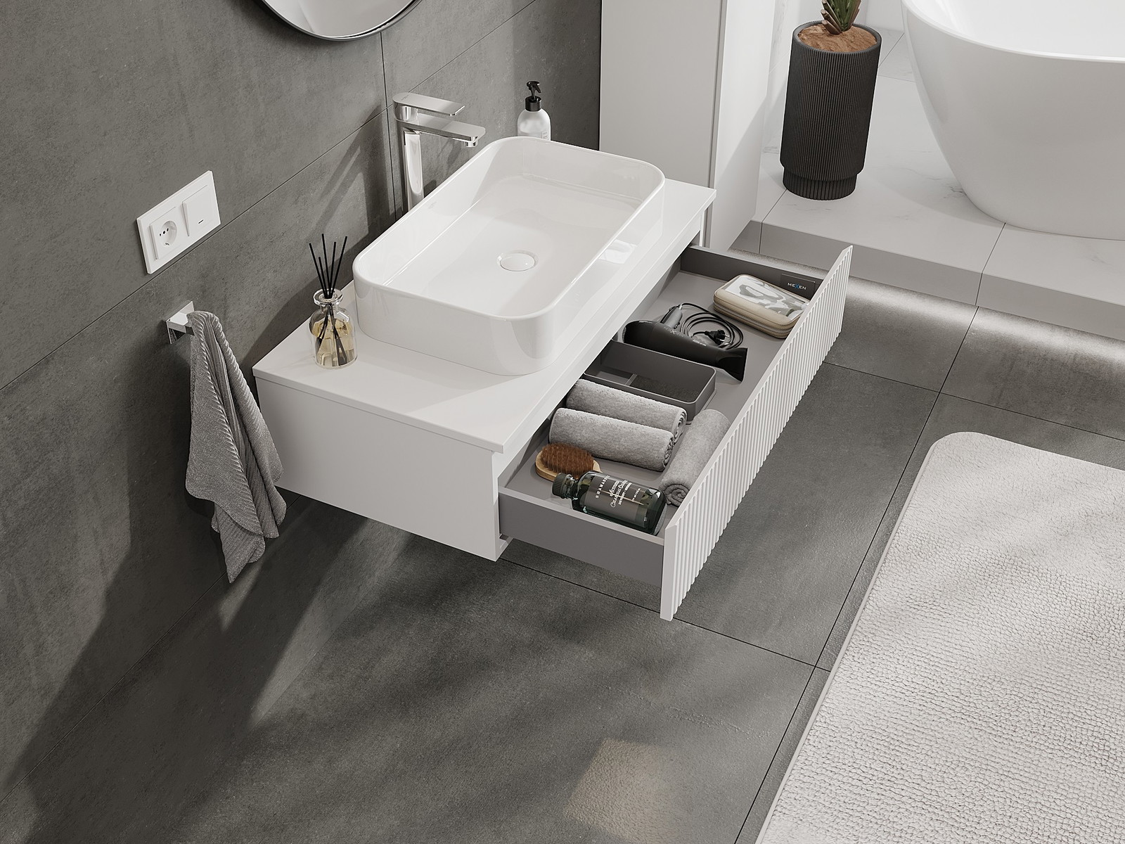 Mexen Rivel kylpyhuonekaappi pesualtaan alle, 90 cm työtasolla, 1 laatikko, uurrettu, mattavalkoinen - 91A20-09023-1-BFC01