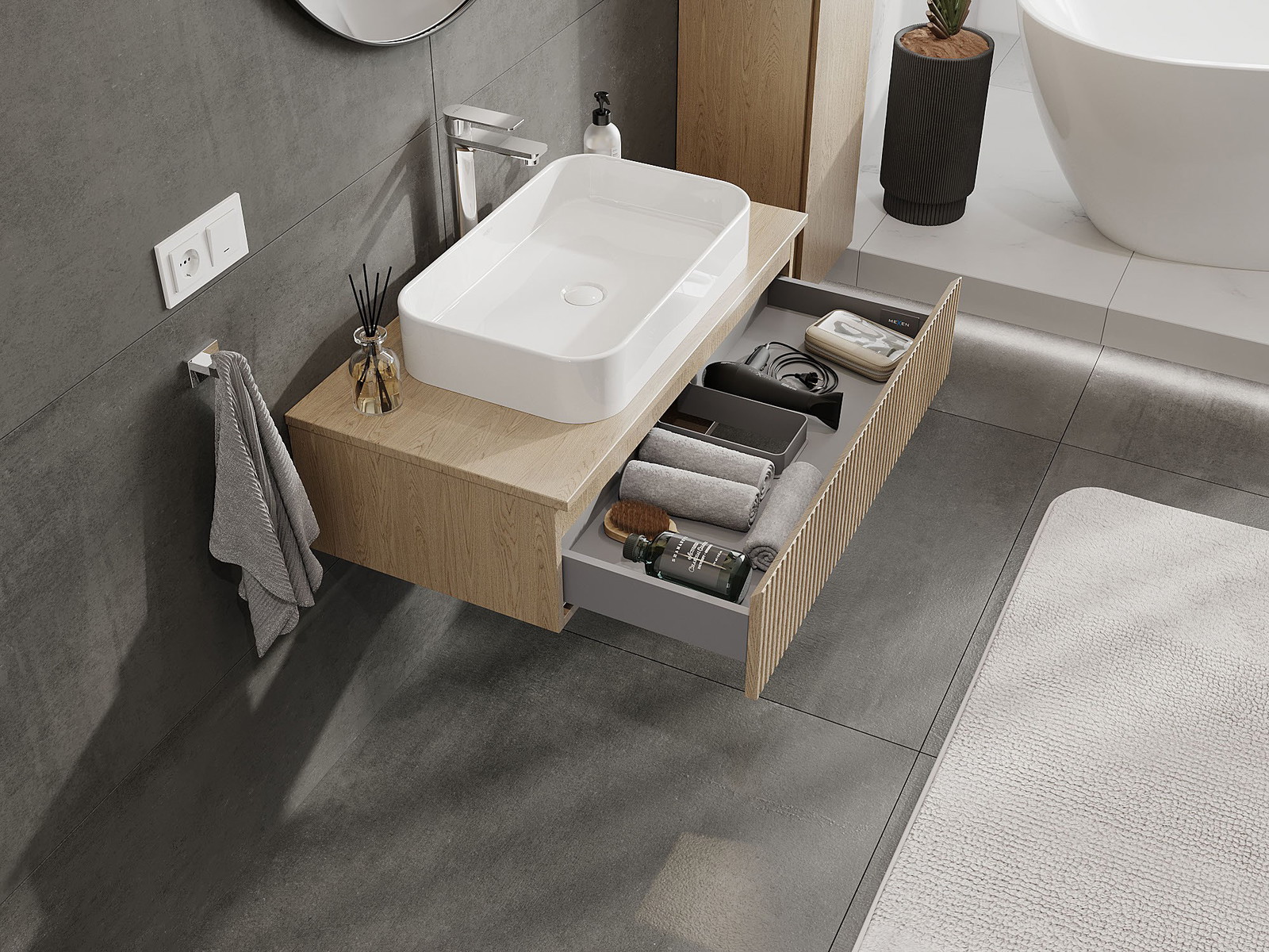 Mexen Rivel kylpyhuonekaappi pesualtaan alapuolella 90 cm, jossa pöytätaso, 1 laatikko, uurrettu, tammi - 91A20-09023-1-BFC81