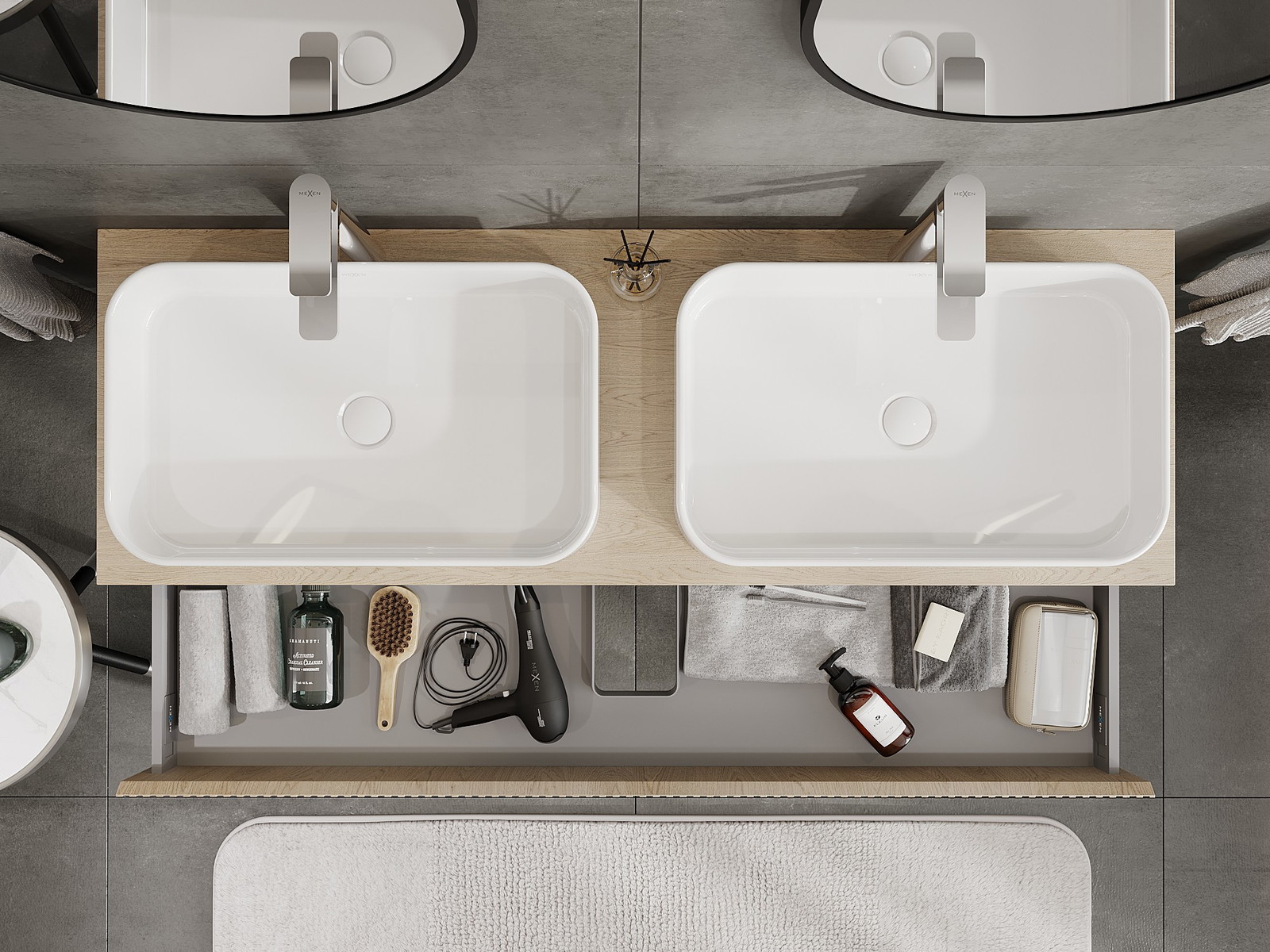Mexen Rivel 140 cm leveä kylpyhuonekaappi pesualtaan alle, työtaso, 1 laatikko, uurrettu, tammi - 91A20-14023-1-BFC81