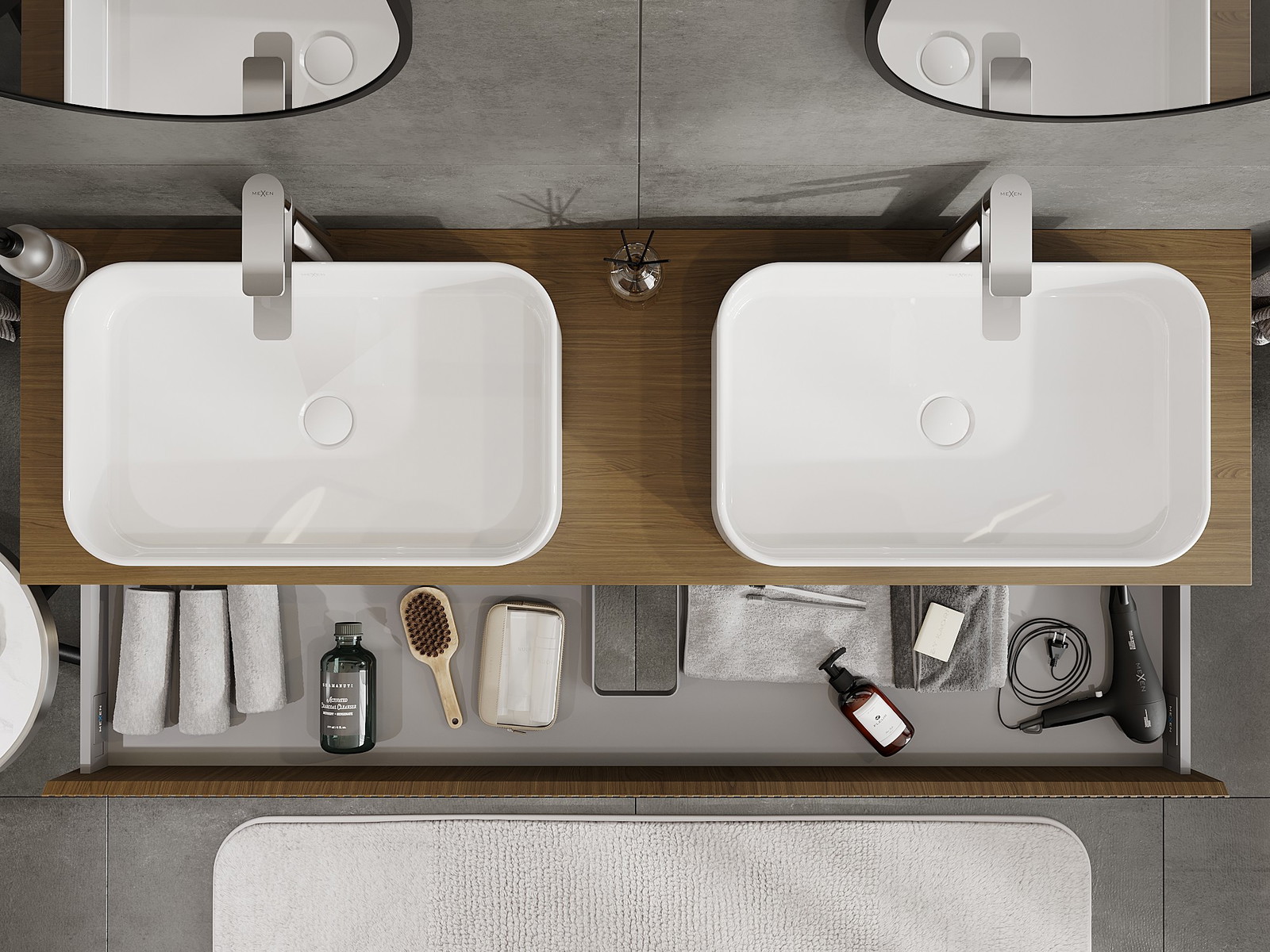 Modulaariset kylpyhuonekalusteemme voidaan yhdistää eri väriyhdistelminä, mikä mahdollistaa täydellisen personoinnin. Voit valita sekä ulkonäön että yksittäisten elementtien toiminnot, mikä mahdollistaa huonekalujen mukauttamisen omien tyylillisten ja käyttöön liittyvien mieltymysten mukaan.