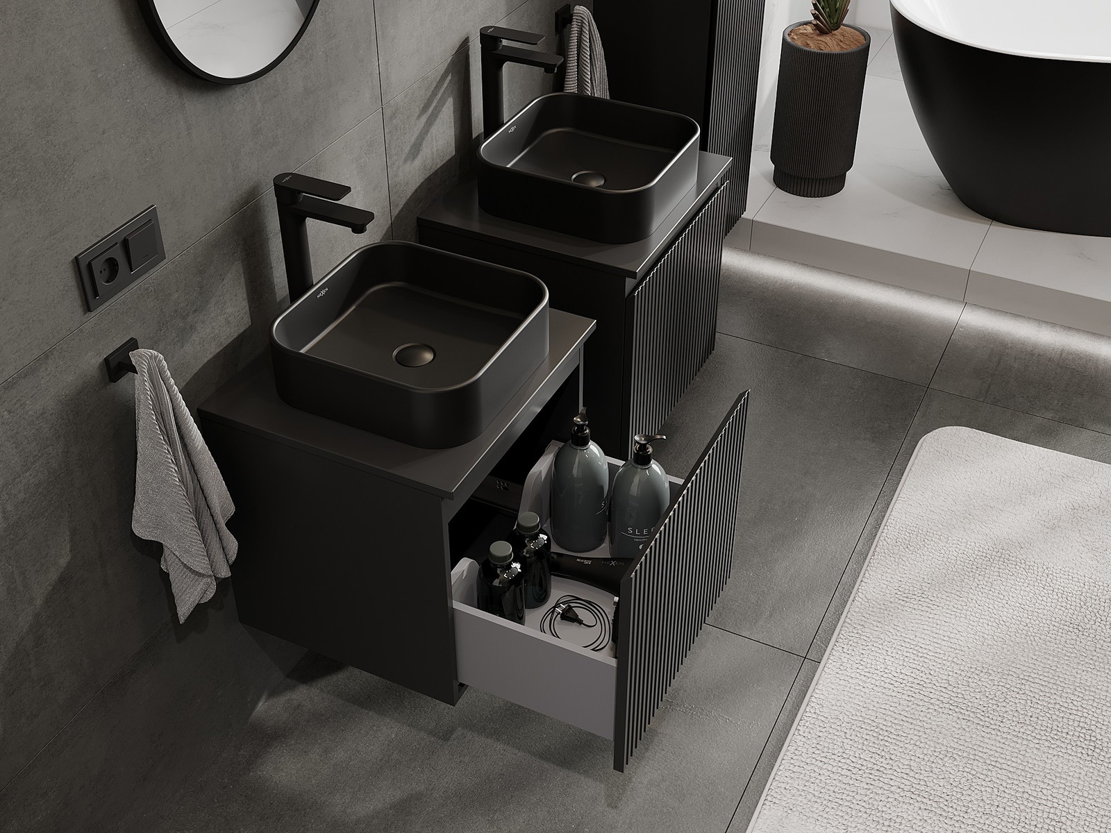 Mexen Rivel kylpyhuoneen allaskaappi 50 cm tasolla, 1 laatikko, uurrettu, musta matta - 91A20-05047-1-BFC71