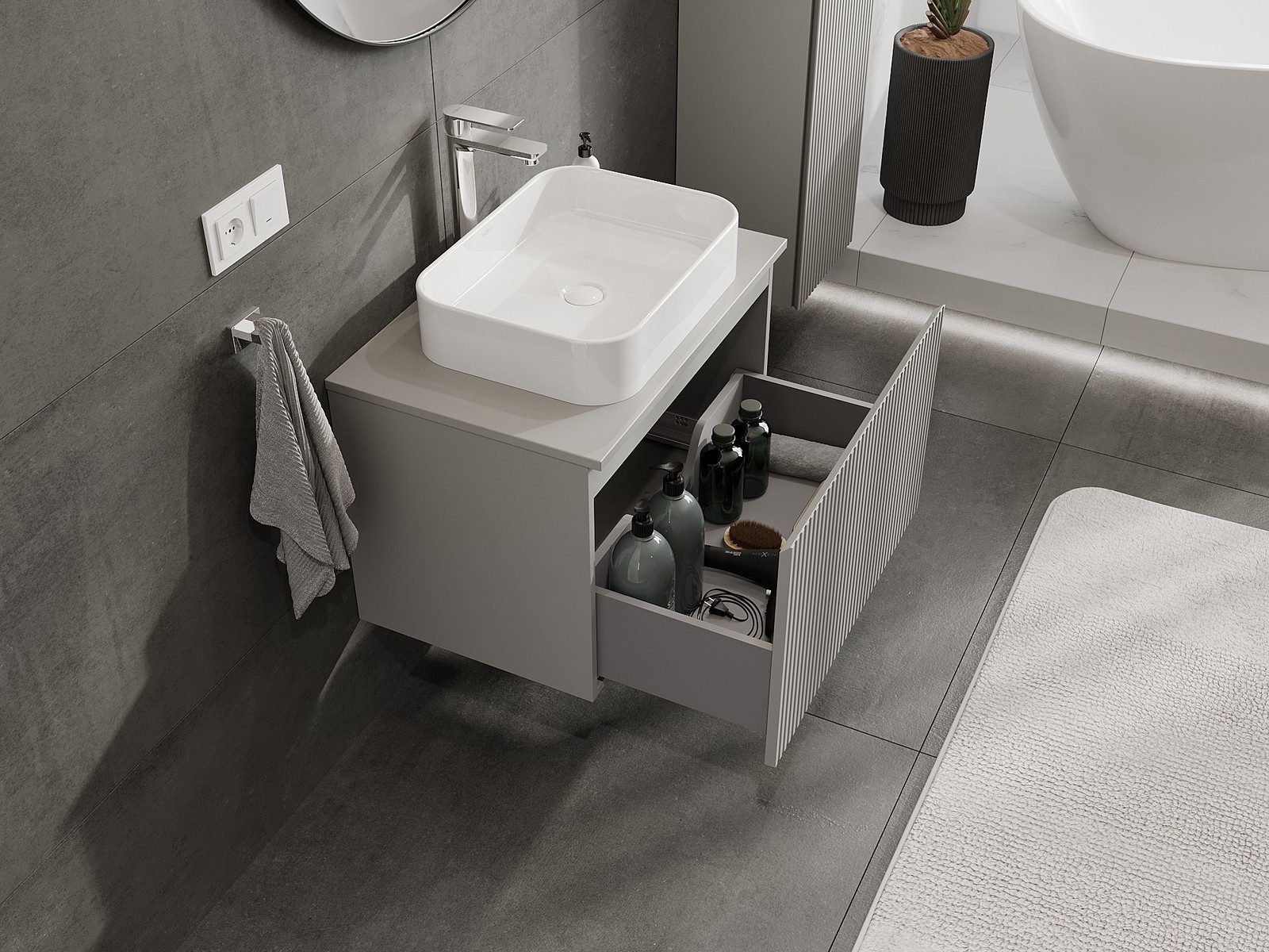 Kiinteiden materiaalien, tarkan työn ja nykyaikaisten teknologisten ratkaisujen ansiosta tuote tarjoaa käyttömukavuutta, kestävyyttä kosteutta ja lämpötilan muutoksia vastaan sekä elegantin ulkonäön, joka sopii erilaisiin kylpyhuonetyyleihin.