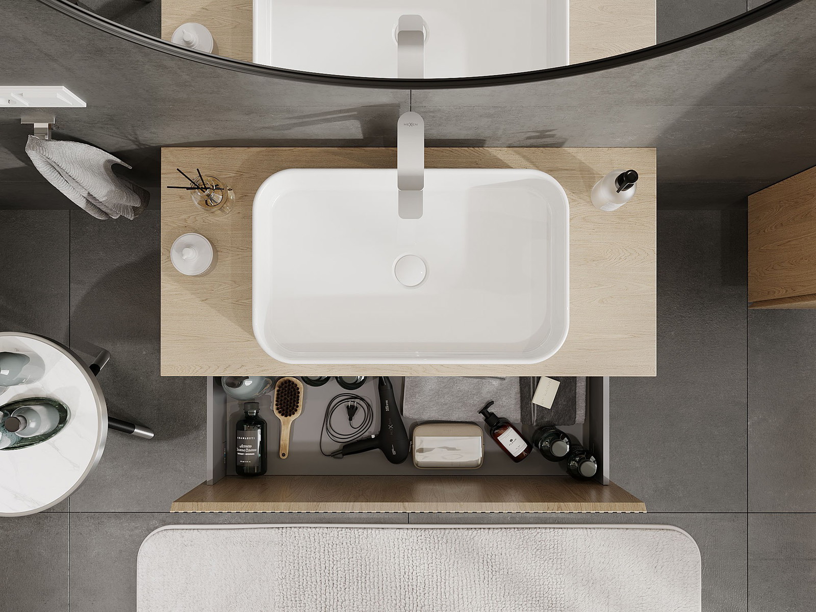 Laatikon leikkaus on suunniteltu siten, että se mahtuu vetolaitteeseen, joka on välttämätön pesuallasasennuksissa. Tämän ansiosta huonekalu voidaan asentaa täysin toimivasti, luopumatta laatikon tilasta asennusten hyväksi.