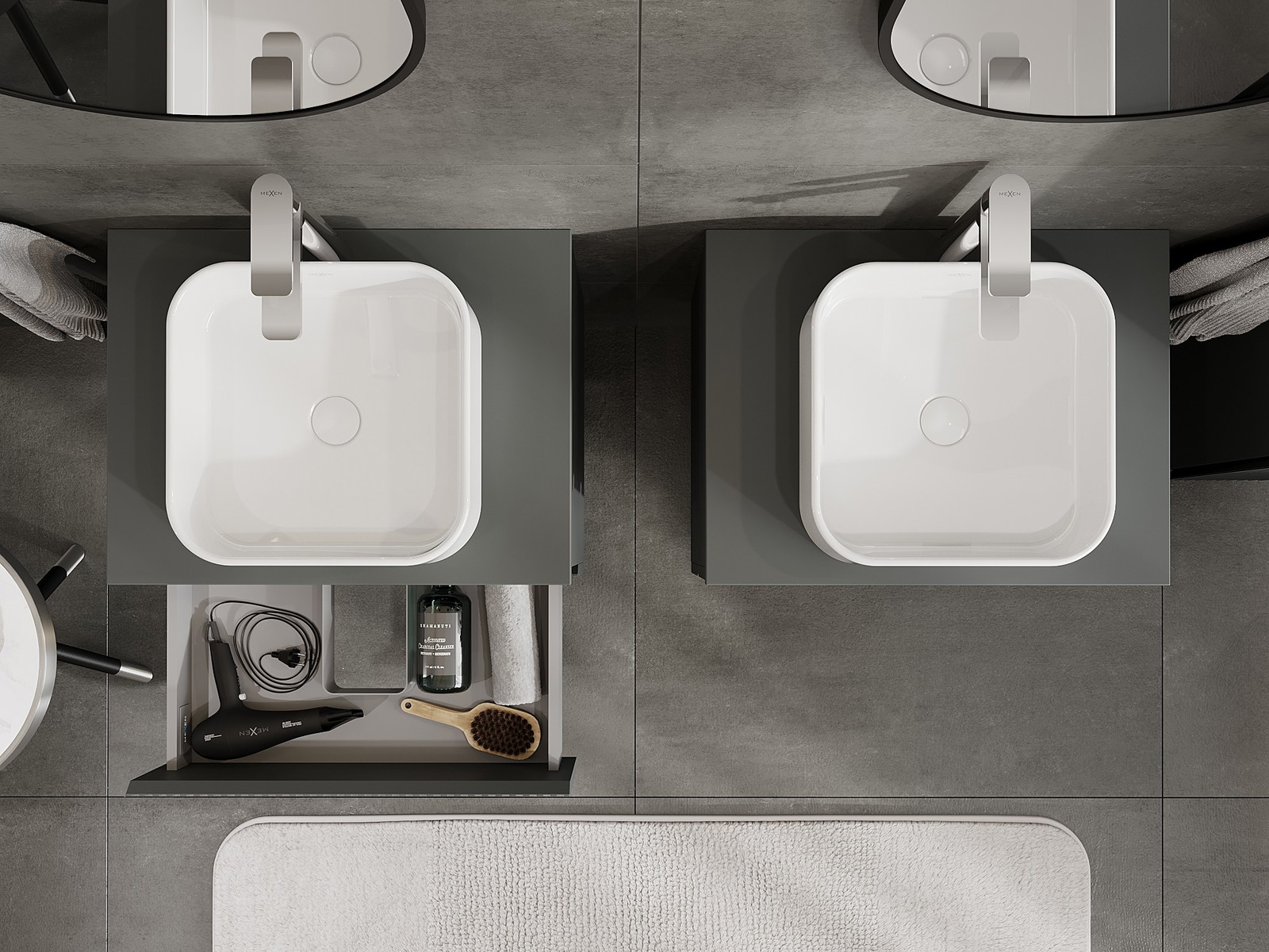 Modulaariset kylpyhuonekalusteemme voidaan yhdistää eri väriyhdistelminä, mikä mahdollistaa täydellisen personoinnin. Voit valita sekä ulkonäön että yksittäisten elementtien toiminnot, mikä mahdollistaa huonekalujen mukauttamisen omien tyylillisten ja käyttöön liittyvien mieltymysten mukaan.
