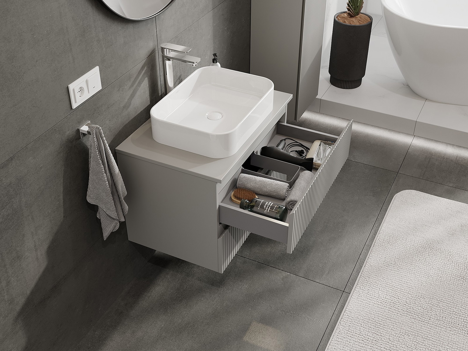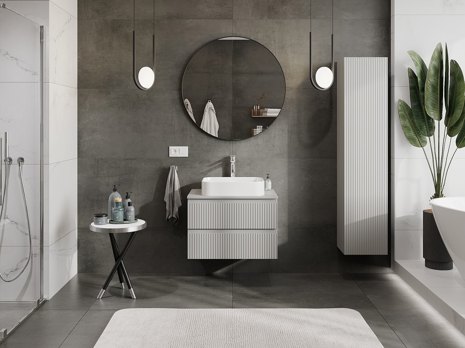 Kiinteiden materiaalien, tarkan työn ja nykyaikaisten teknologisten ratkaisujen ansiosta tuote tarjoaa käyttömukavuutta, kestävyyttä kosteutta ja lämpötilan muutoksia vastaan sekä elegantin ulkonäön, joka sopii erilaisiin kylpyhuonetyyleihin.