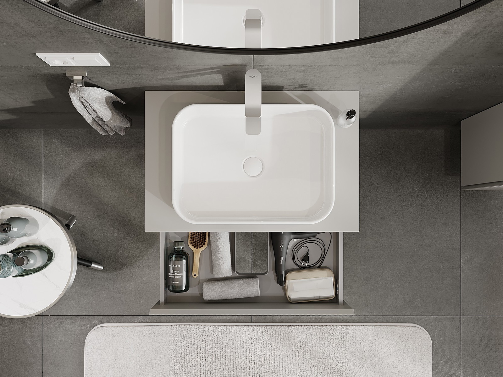 Laatikon leikkaus on suunniteltu siten, että se mahtuu vetolaitteeseen, joka on välttämätön pesuallasasennuksissa. Tämän ansiosta huonekalu voidaan asentaa täysin toimivasti, luopumatta laatikon tilasta asennusten hyväksi.