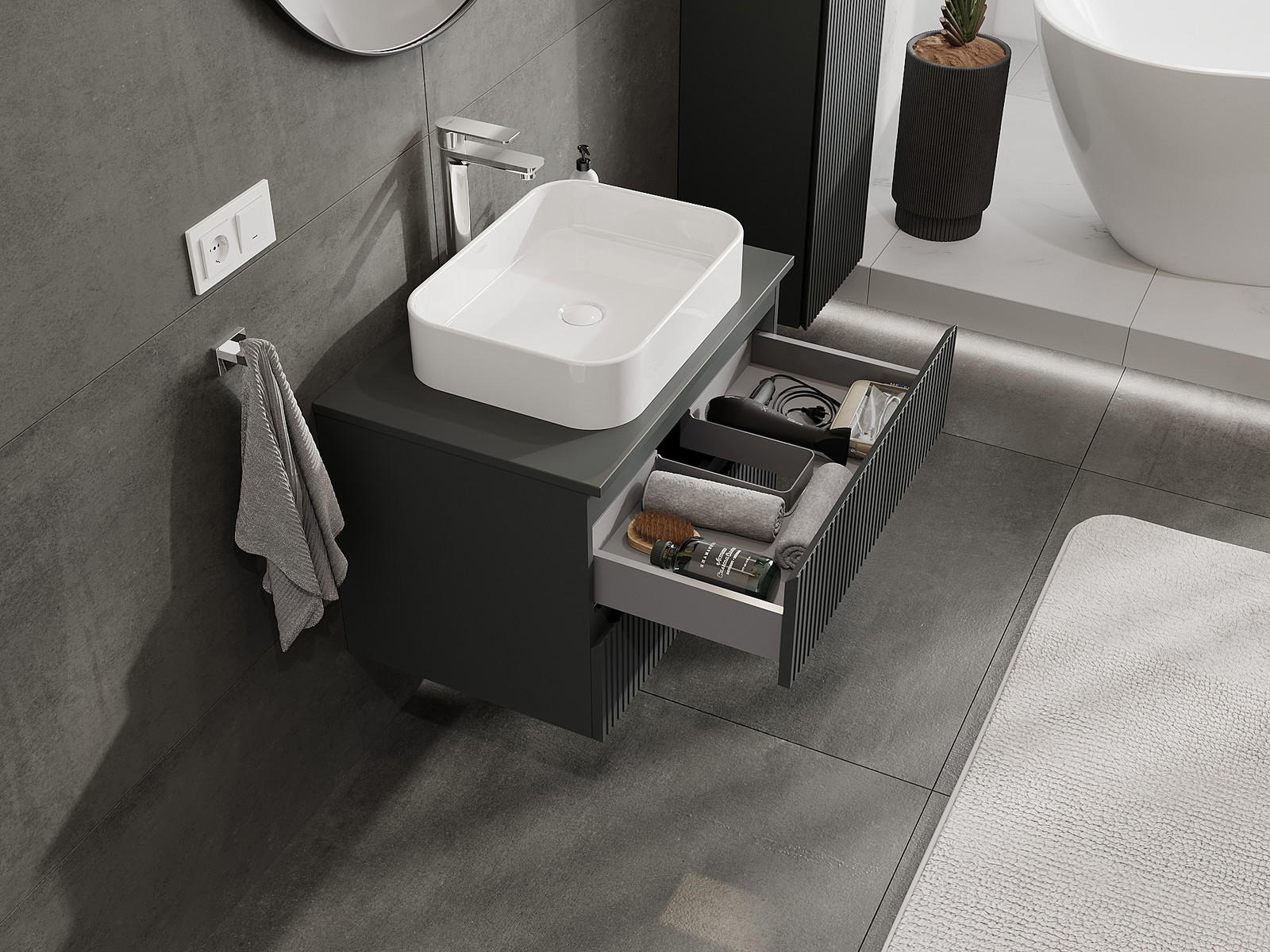 Kiinteiden materiaalien, tarkan työn ja nykyaikaisten teknologisten ratkaisujen ansiosta tuote tarjoaa käyttömukavuutta, kestävyyttä kosteutta ja lämpötilan muutoksia vastaan sekä elegantin ulkonäön, joka sopii erilaisiin kylpyhuonetyyleihin.