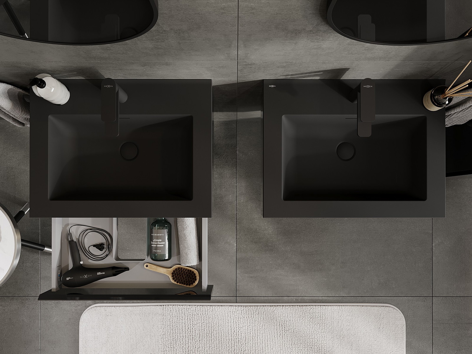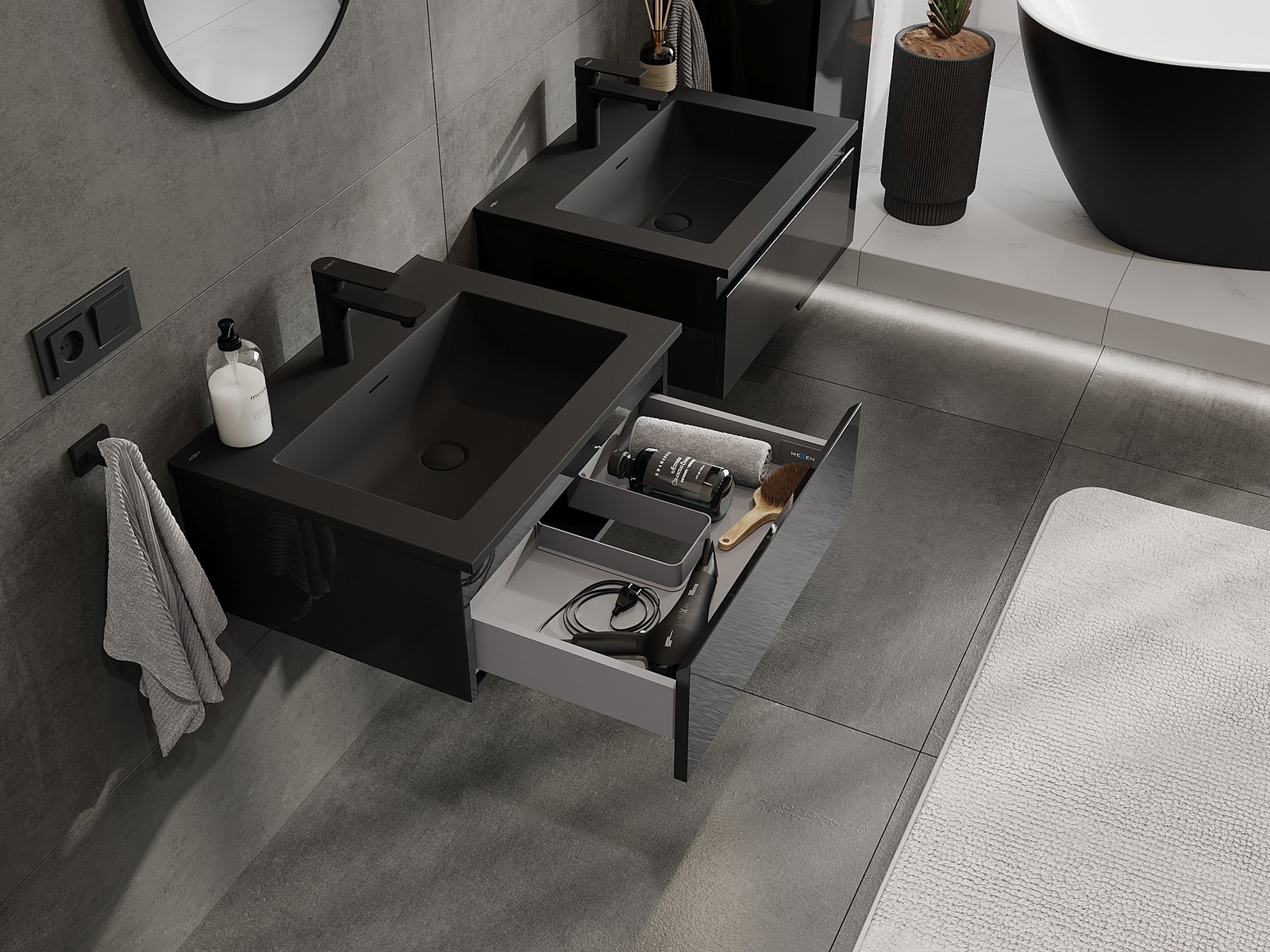 Mexen Orio 60 cm leveä kylpyhuonekaappi altaalla Otis, 1 laatikko, musta kiiltävä/musta matta - 91A10-06023-1-BF70-W18M71
