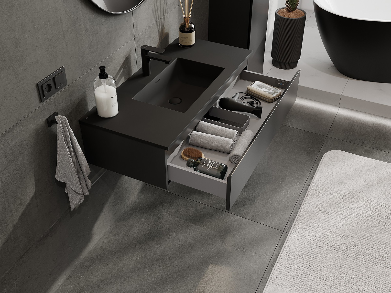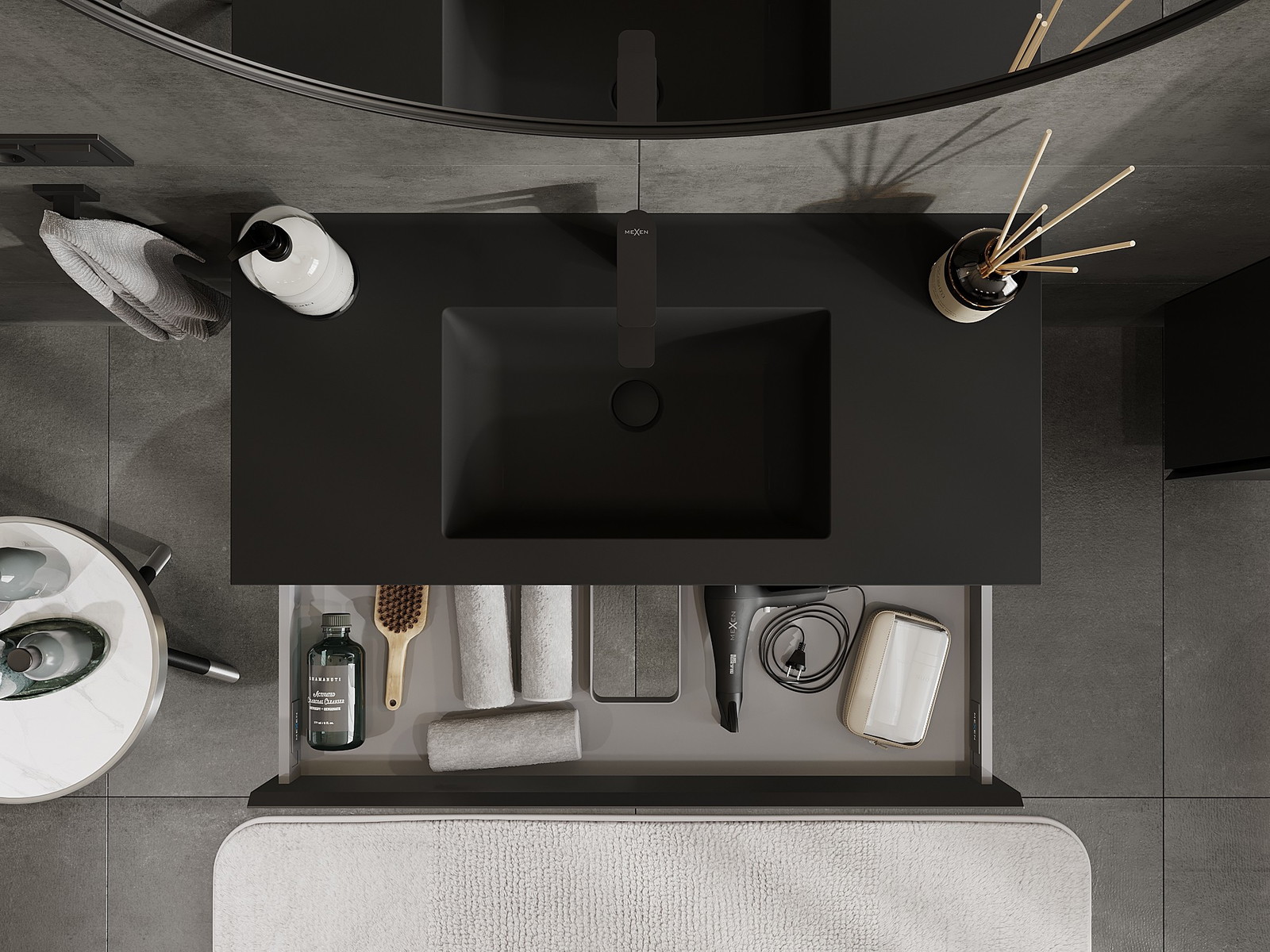 Mexen Orio kylpyhuonekaappi 100 cm pesualtaalla Otis, 1 laatikko, musta matta - 91A10-10023-1-BF71-W18M71