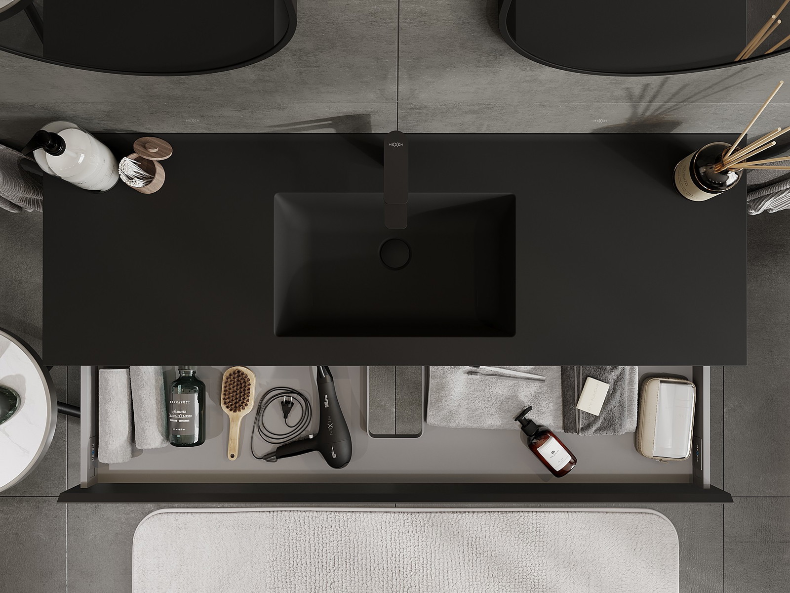 Mexen Orio kylpyhuonekaappi 140 cm pesualtaalla Otis, 1 laatikko, musta matta - 91A10-14023-1-BF71-W18M71