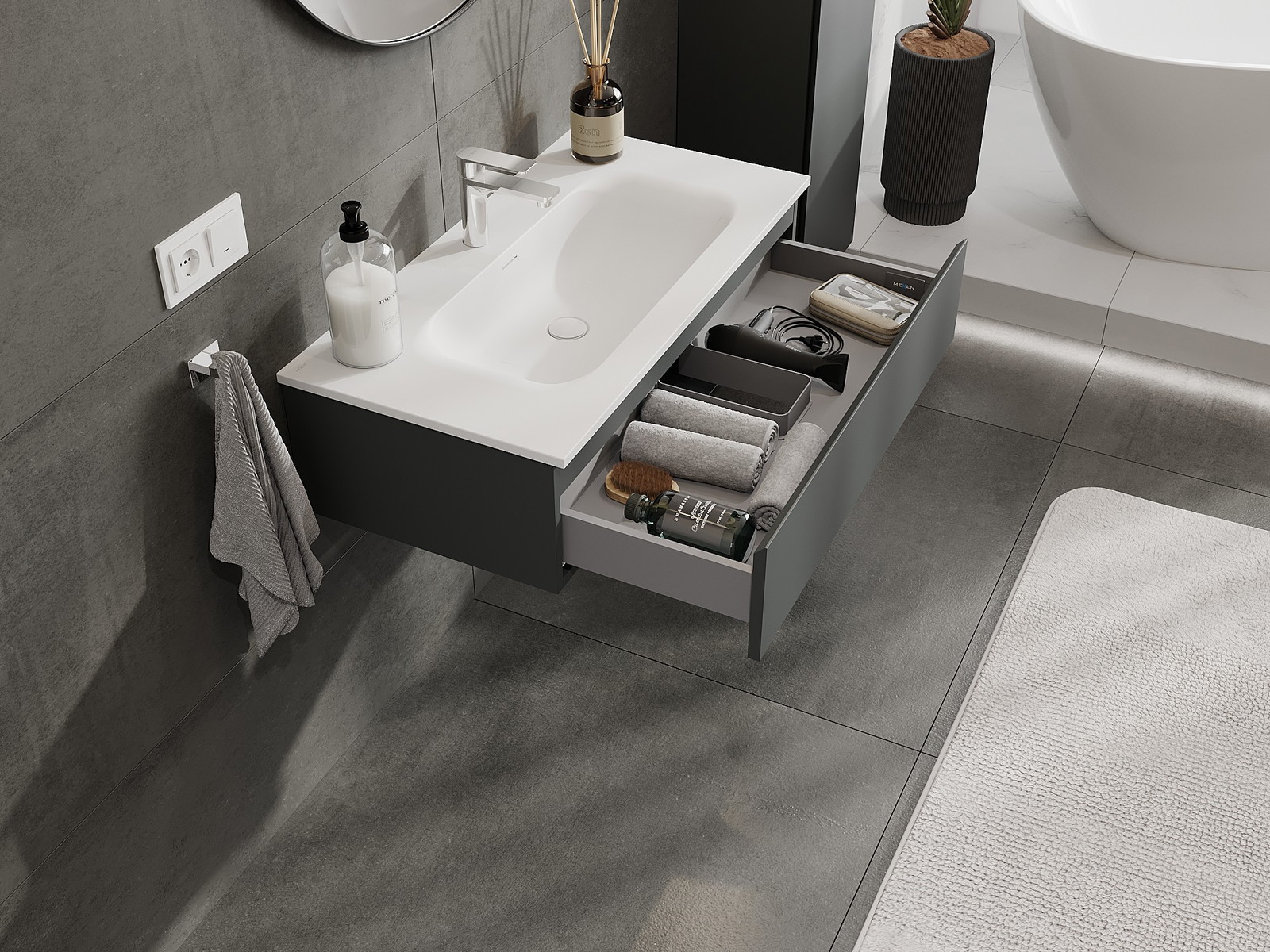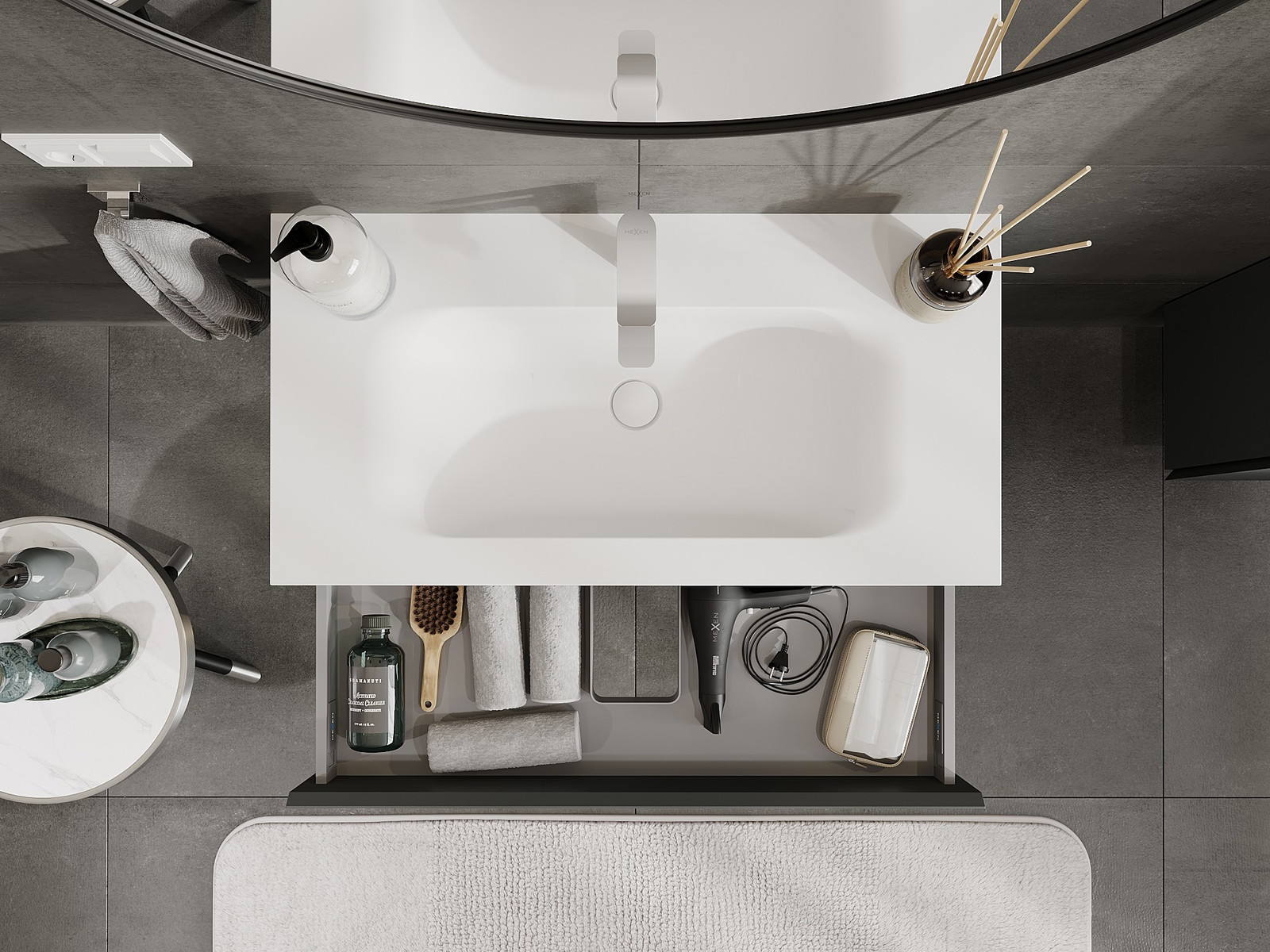 Mexen Orio kylpyhuonekaappi 90 cm pesualtaalla Vela, 1 laatikko, grafiitin matta/valkoinen matta - 91A10-09023-1-BF66-W23M01