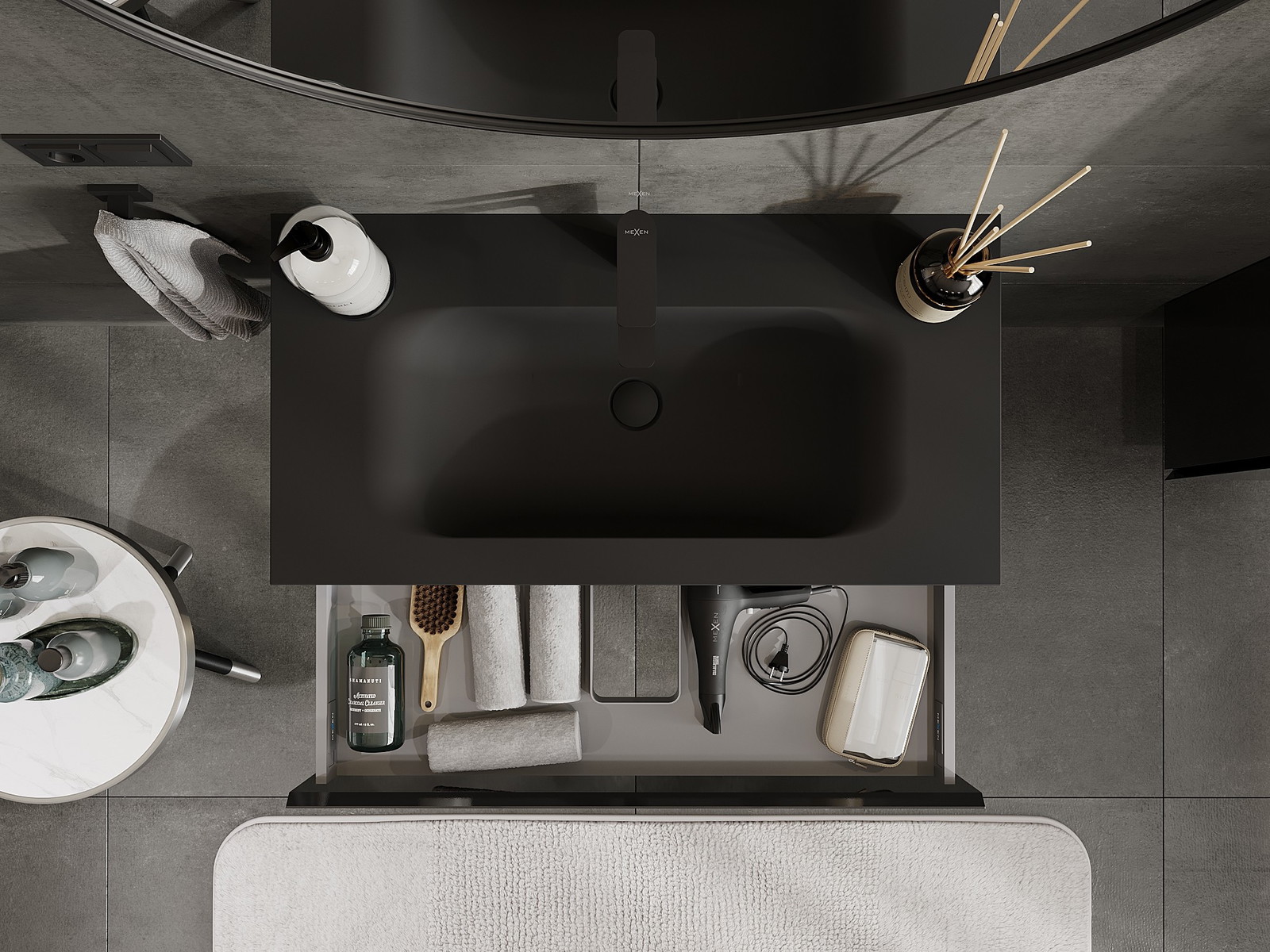 Mexen Orio kylpyhuonekaappi 90 cm pesualtaalla Vela, 1 laatikko, musta kiiltävä/musta matta - 91A10-09023-1-BF70-W23M71