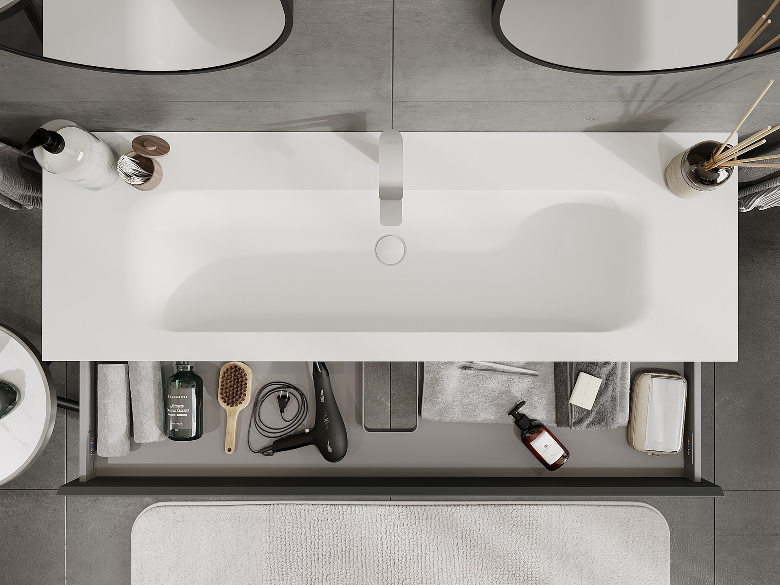 Mexen Orio kylpyhuonekaappi 140 cm pesualtaalla Vela, 1 laatikko, grafiitin matta/valkoinen matta - 91A10-14023-1-BF66-W23M01