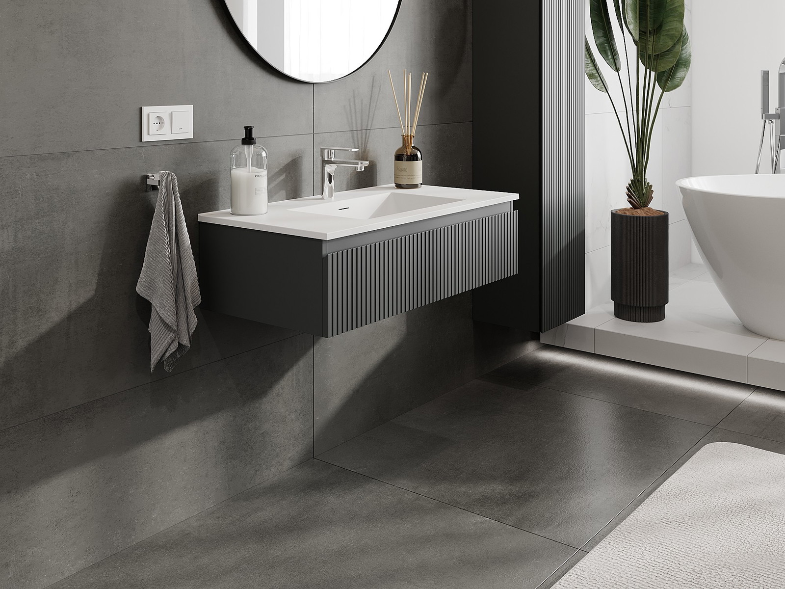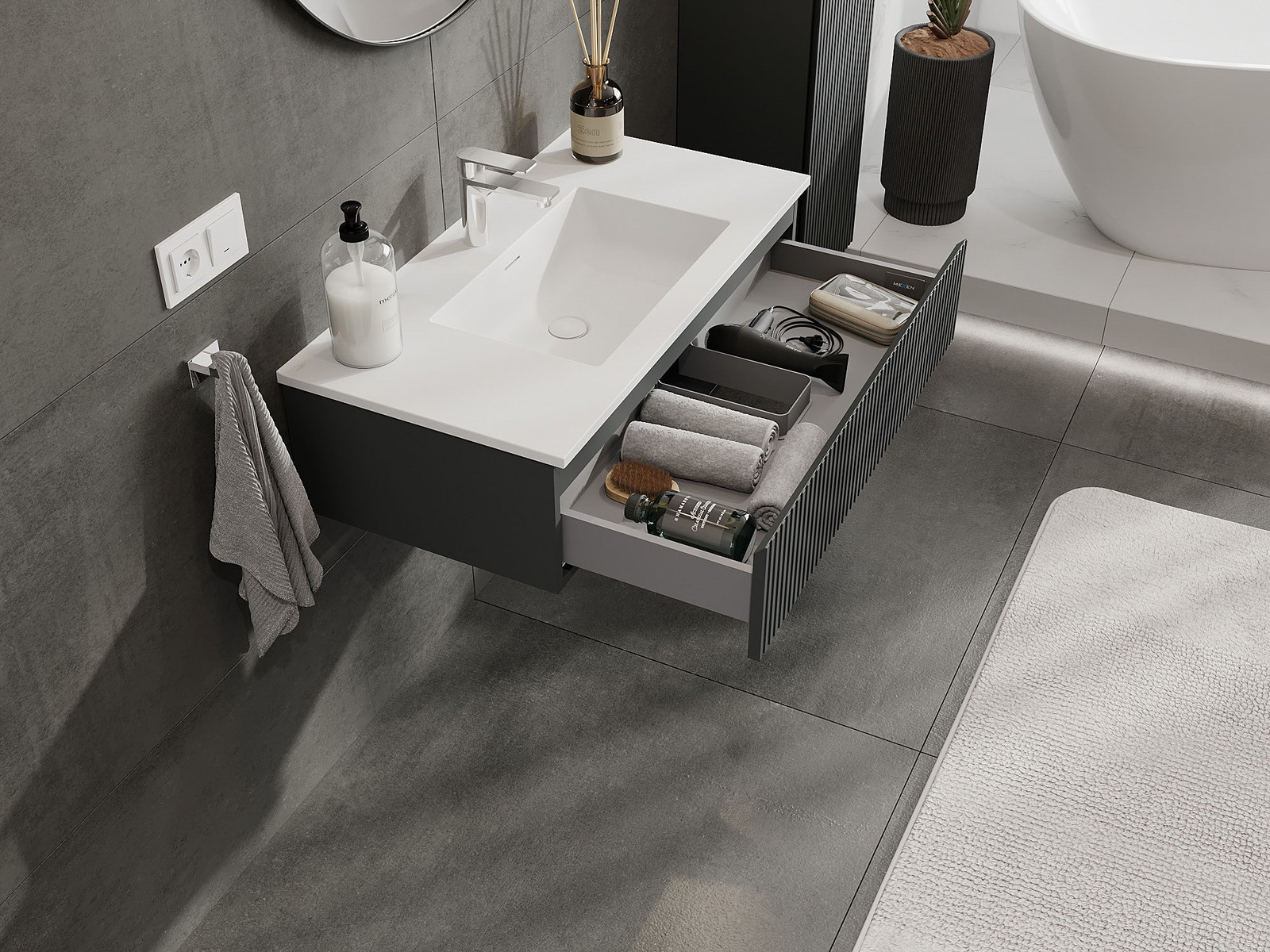 Mexen Rivel kylpyhuonekaappi 90 cm pesualtaalla Otis, 1 laatikko, uritettu, grafiitinharmaa matta/valkoinen matta