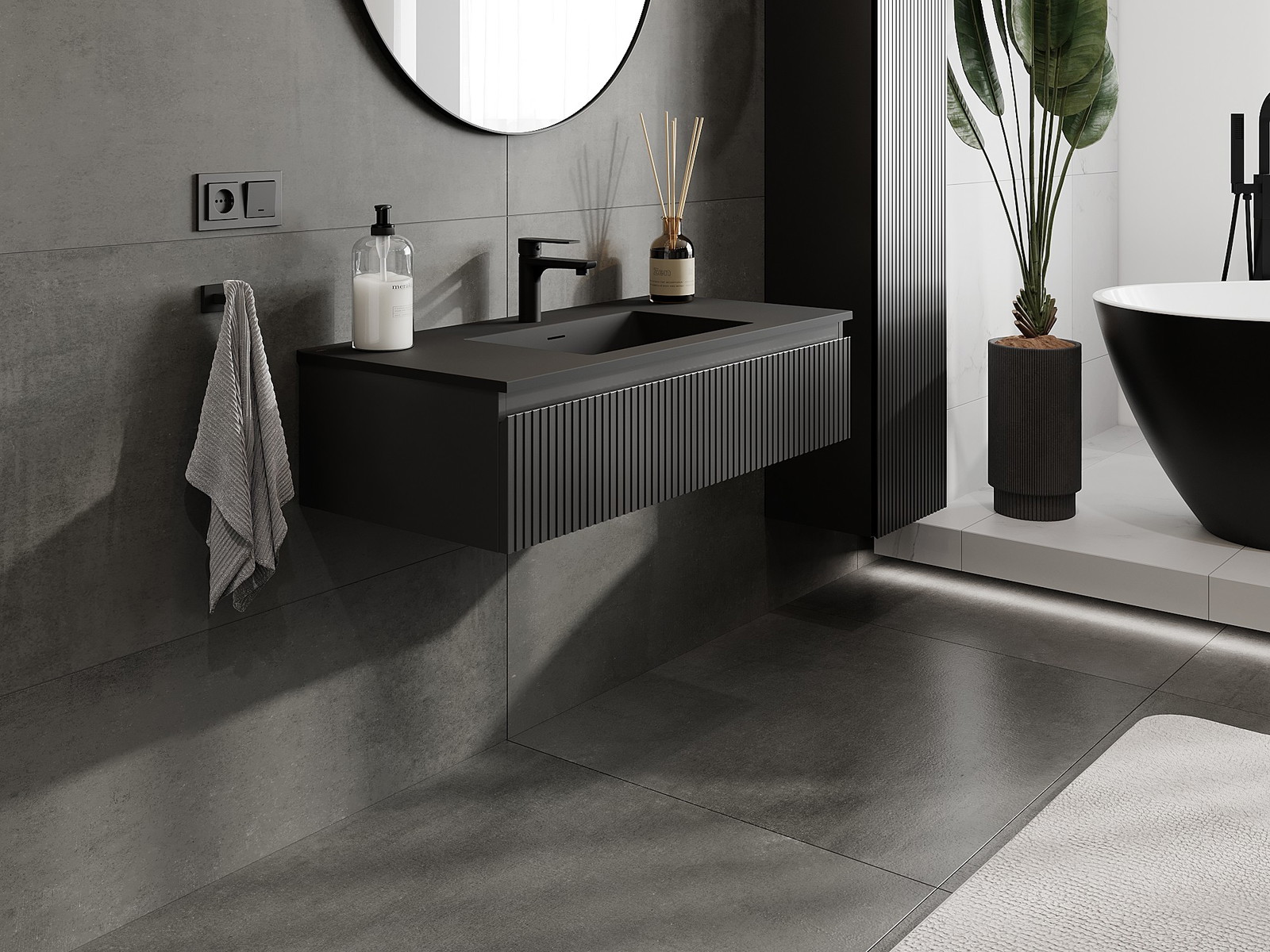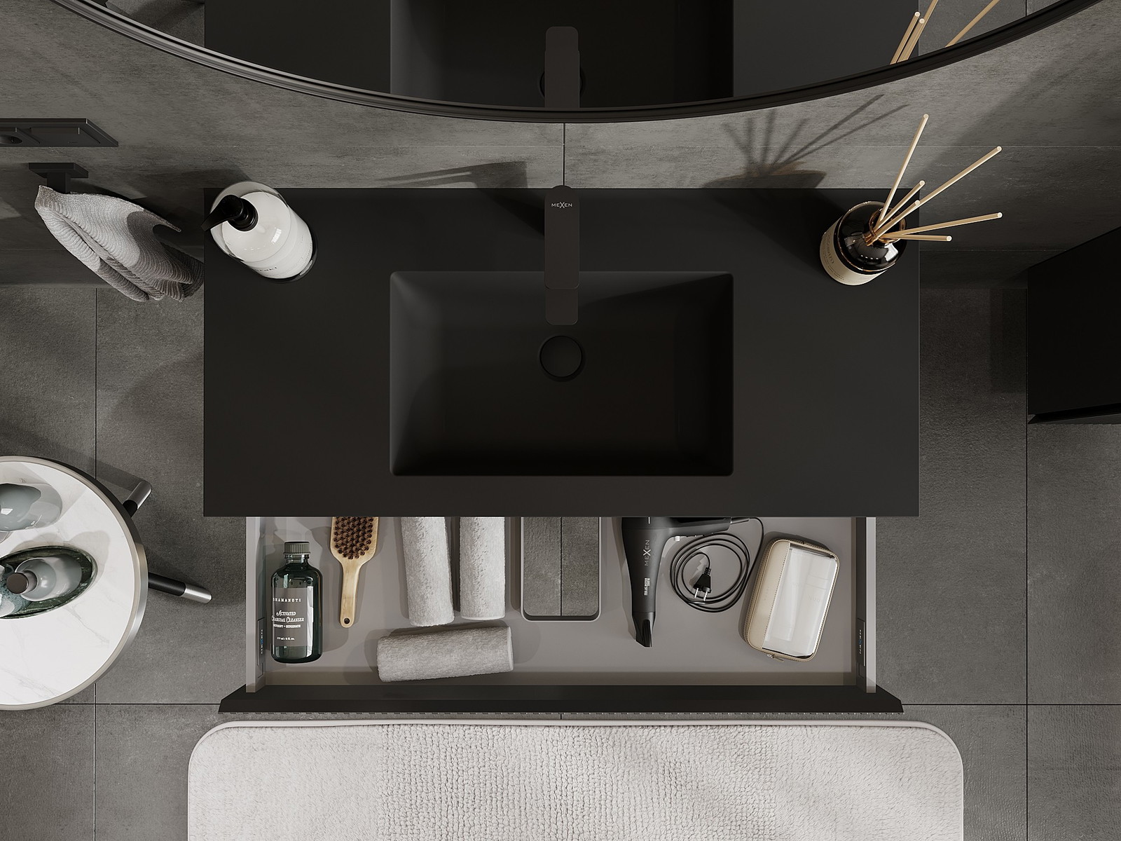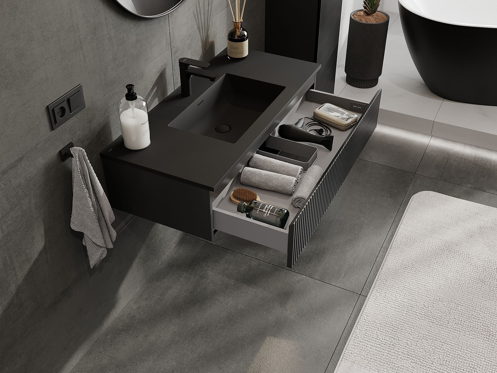 Mexen Rivel 100 cm kylpyhuonekaappi pesualtaalla Otis, 1 laatikko, uurrettu, musta matta - 91A20-10023-1-BF71-W18M71