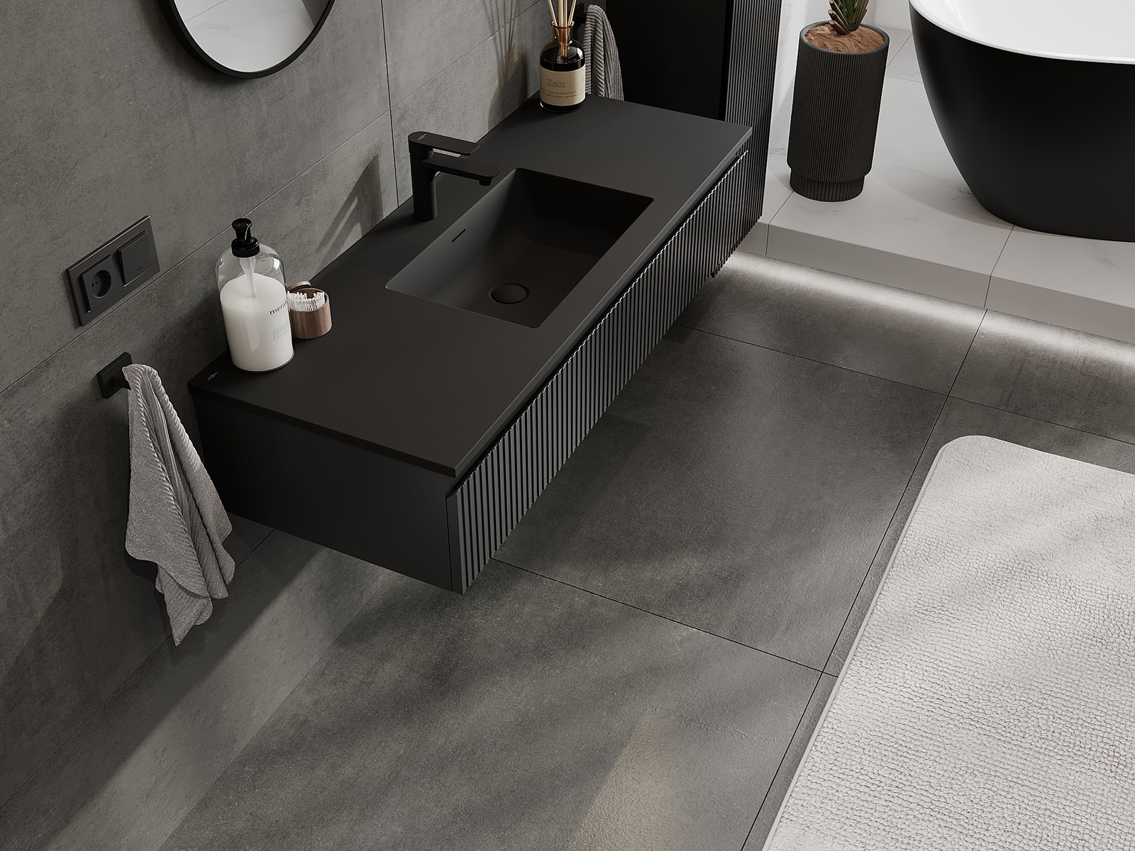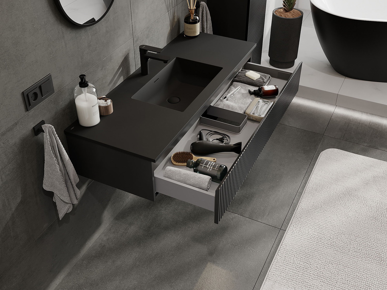 Mexen Rivel kylpyhuonekaappi 120 cm pesualtaalla Otis, 1 laatikko, uurrettu, musta matta - 91A20-12023-1-BF71-W18M71