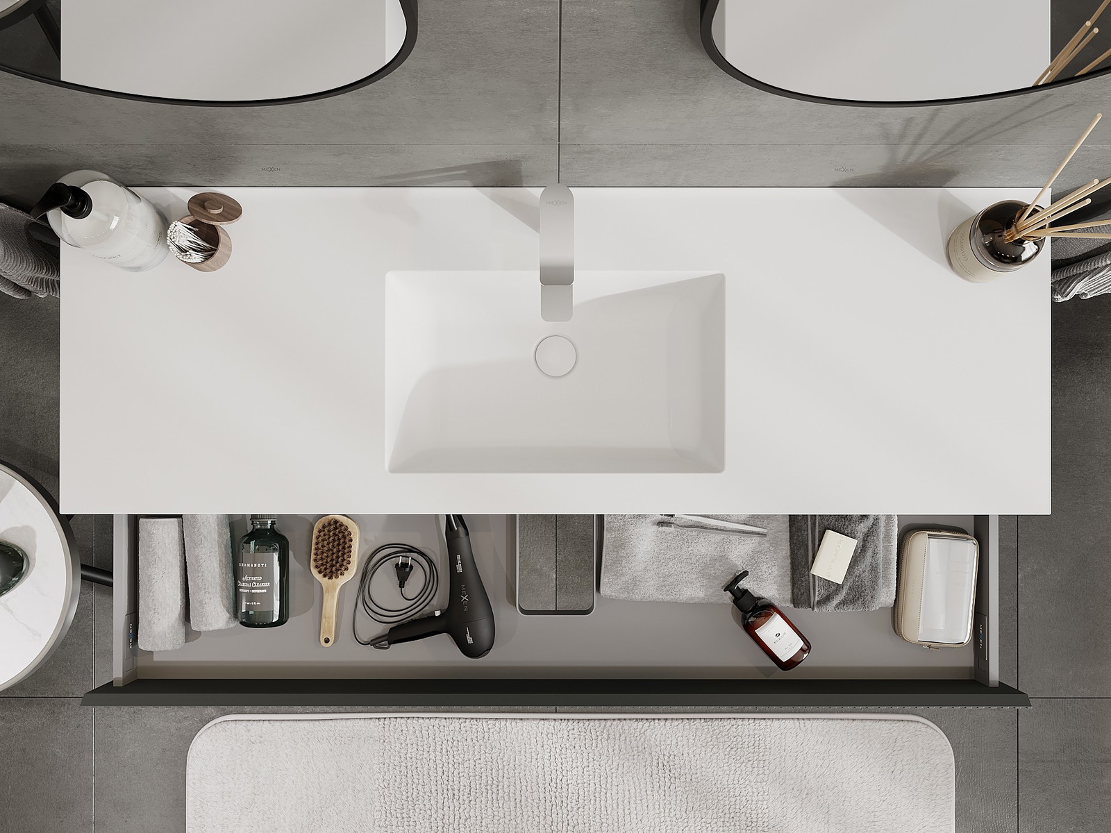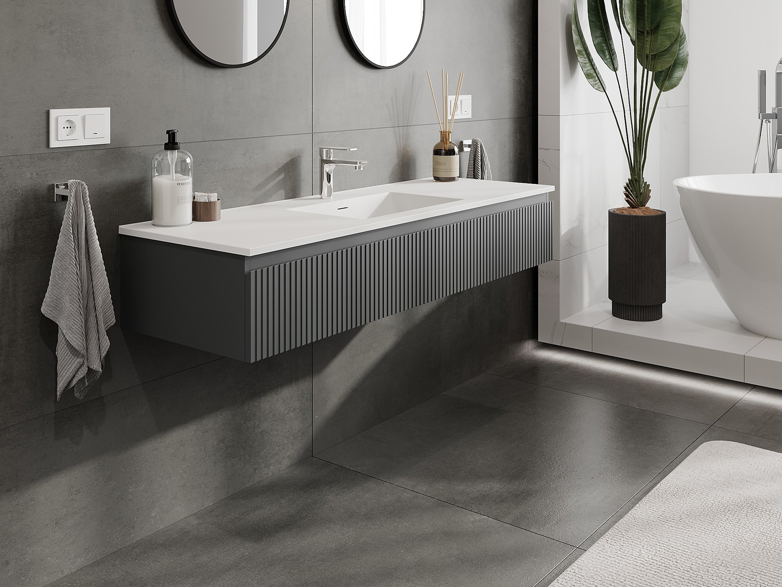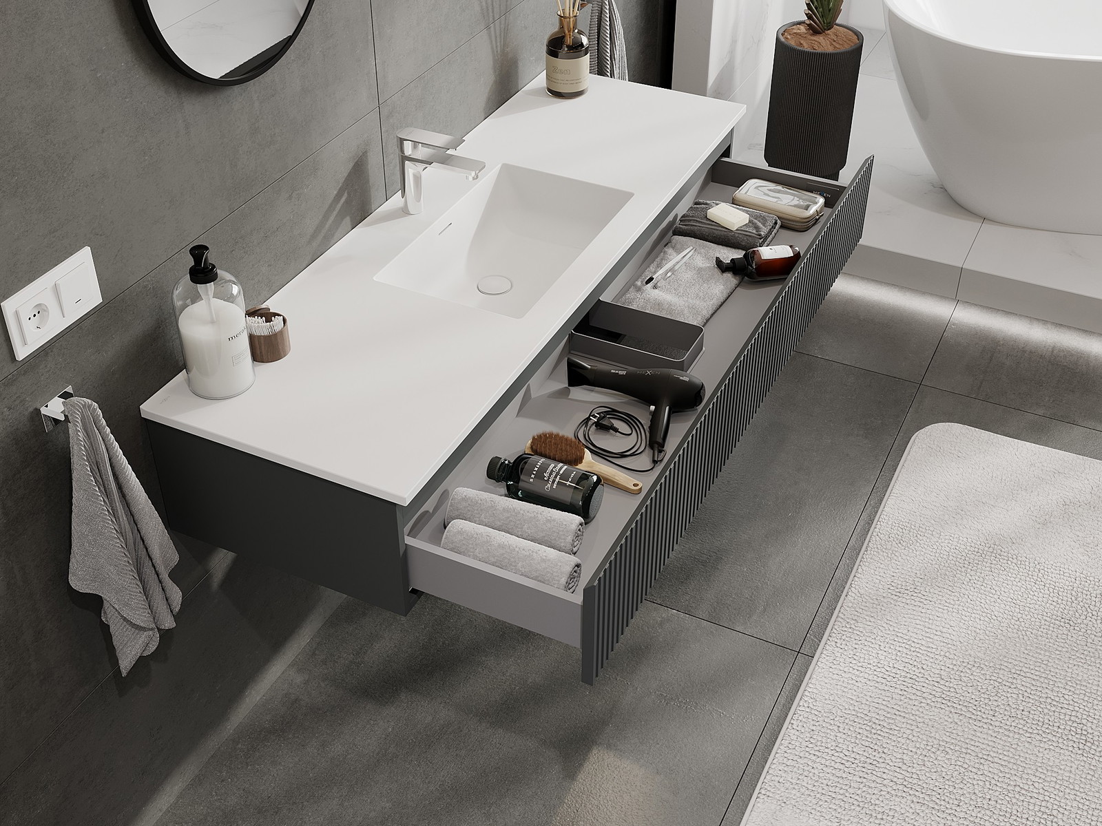 Mexen Rivel kylpyhuonekaappi 140 cm pesualtaalla Otis, 1 laatikko, uritettu, grafiitin matta/valkoinen matta -