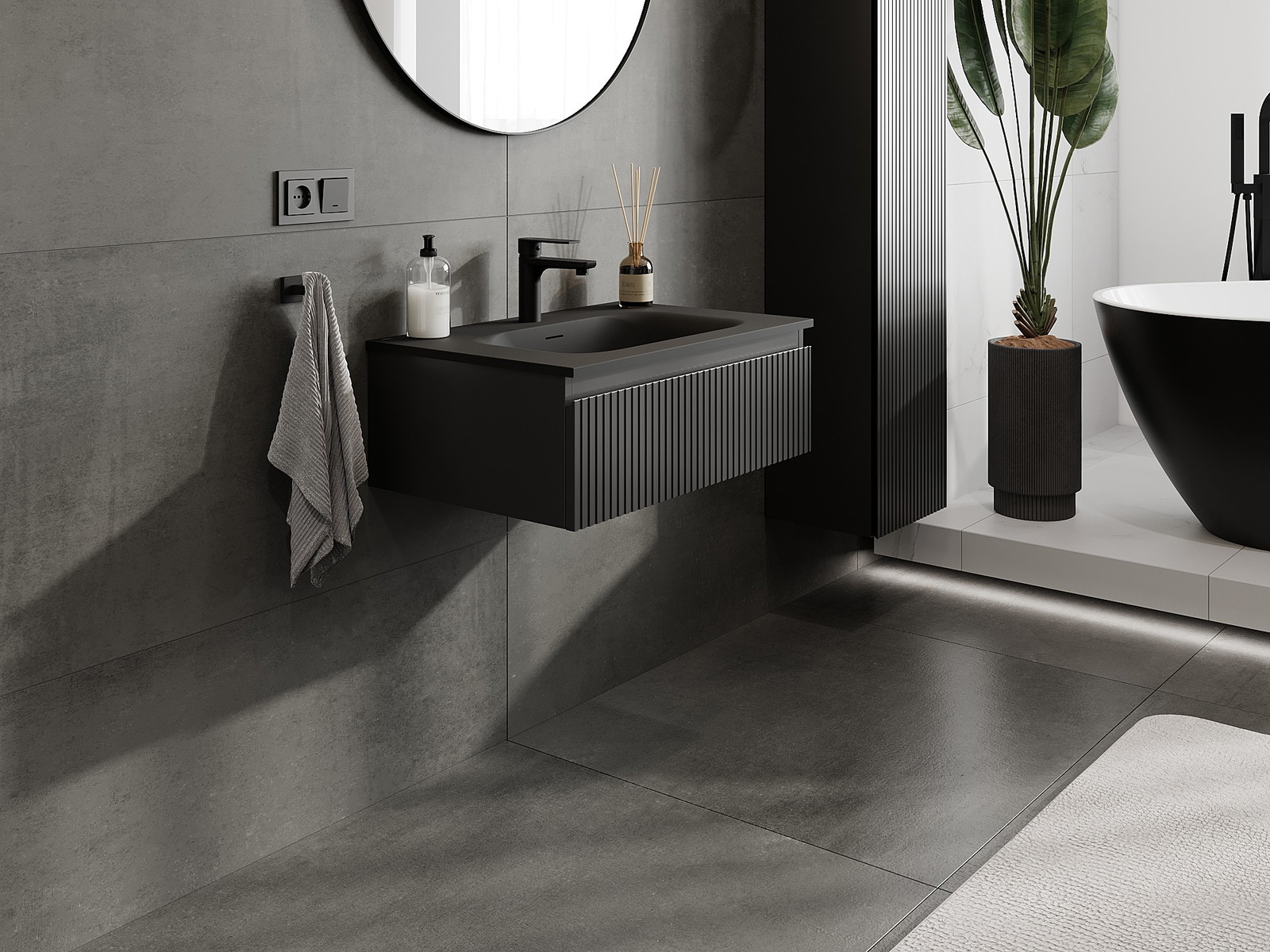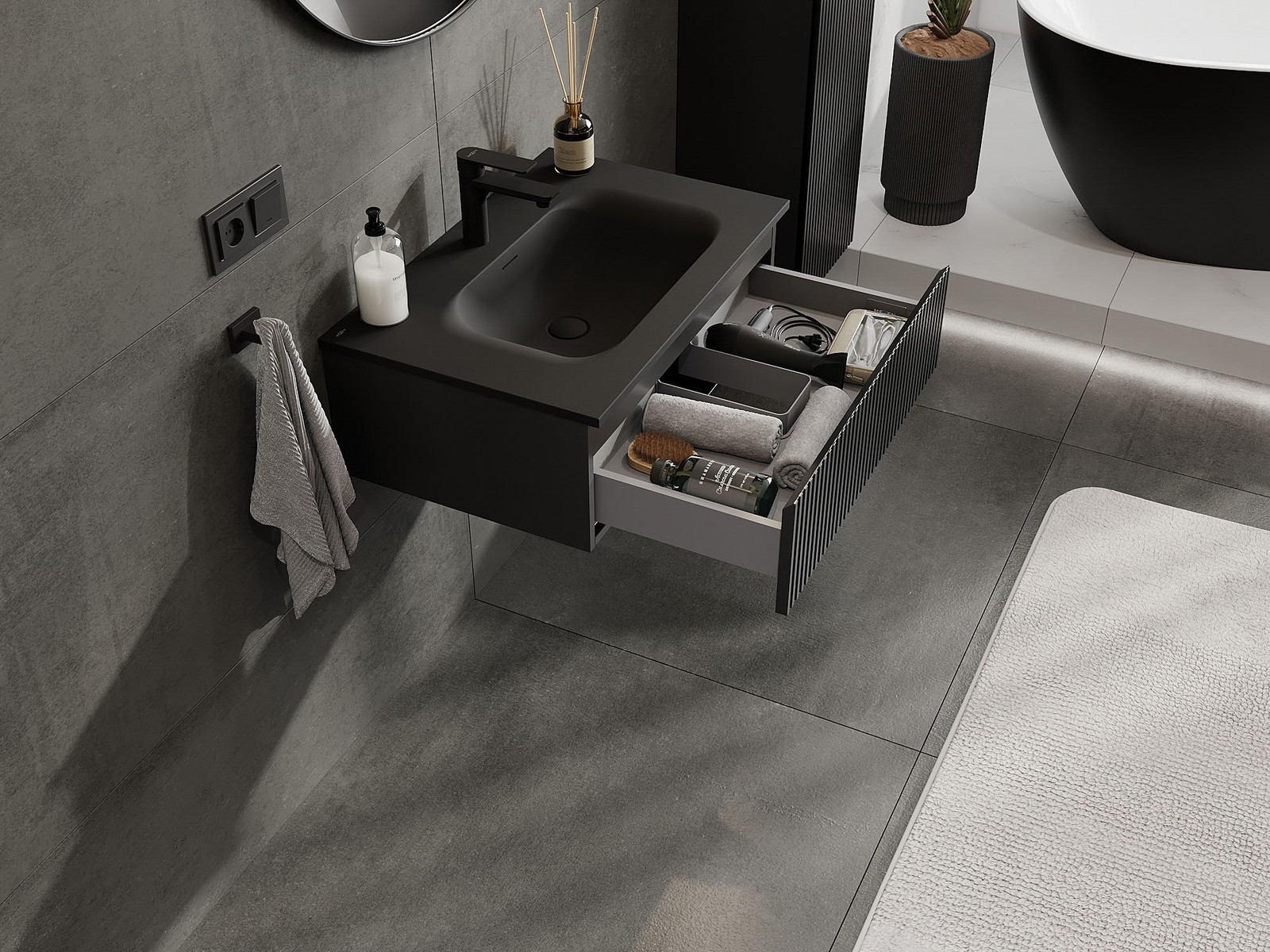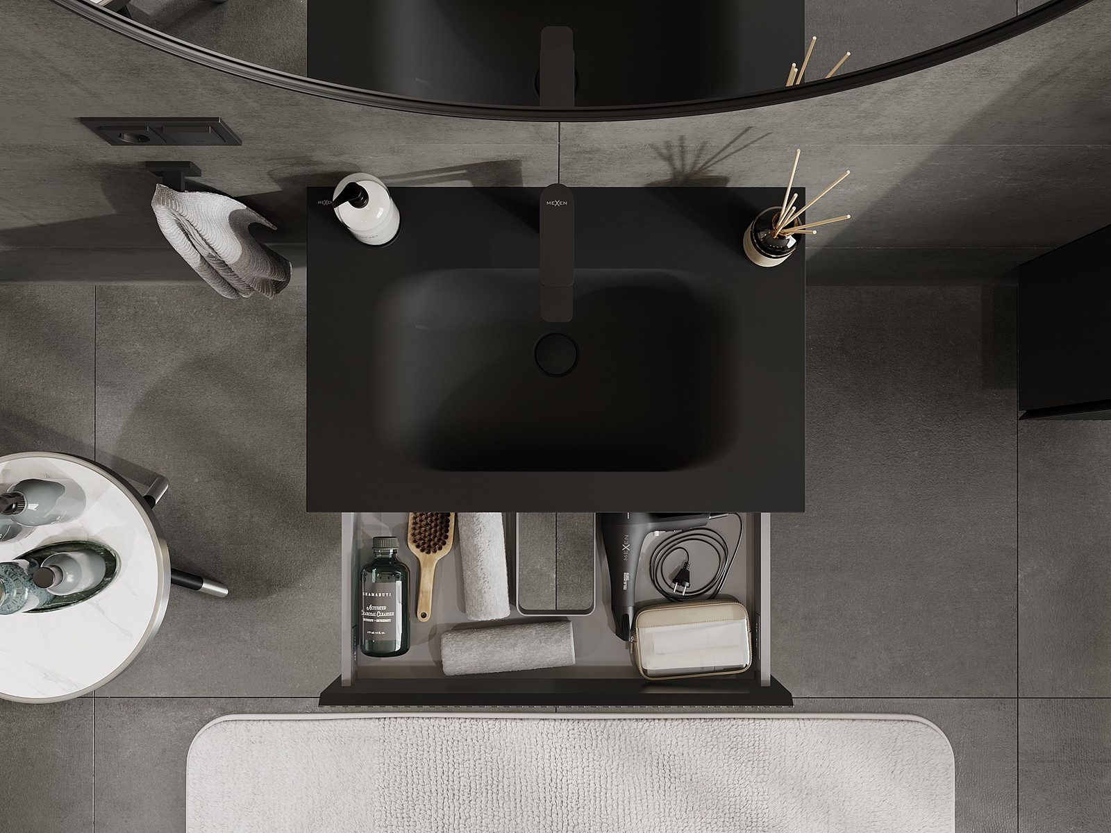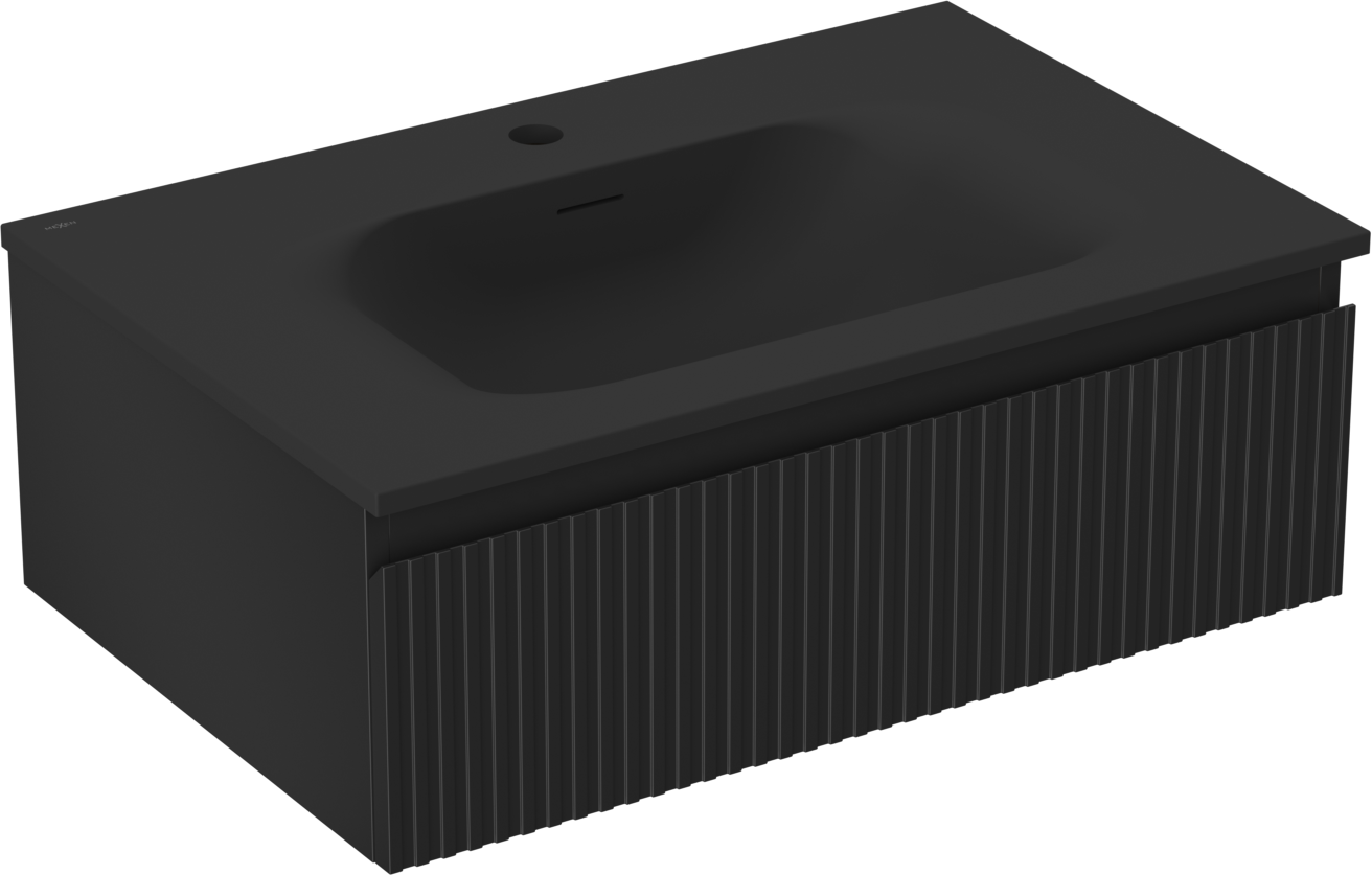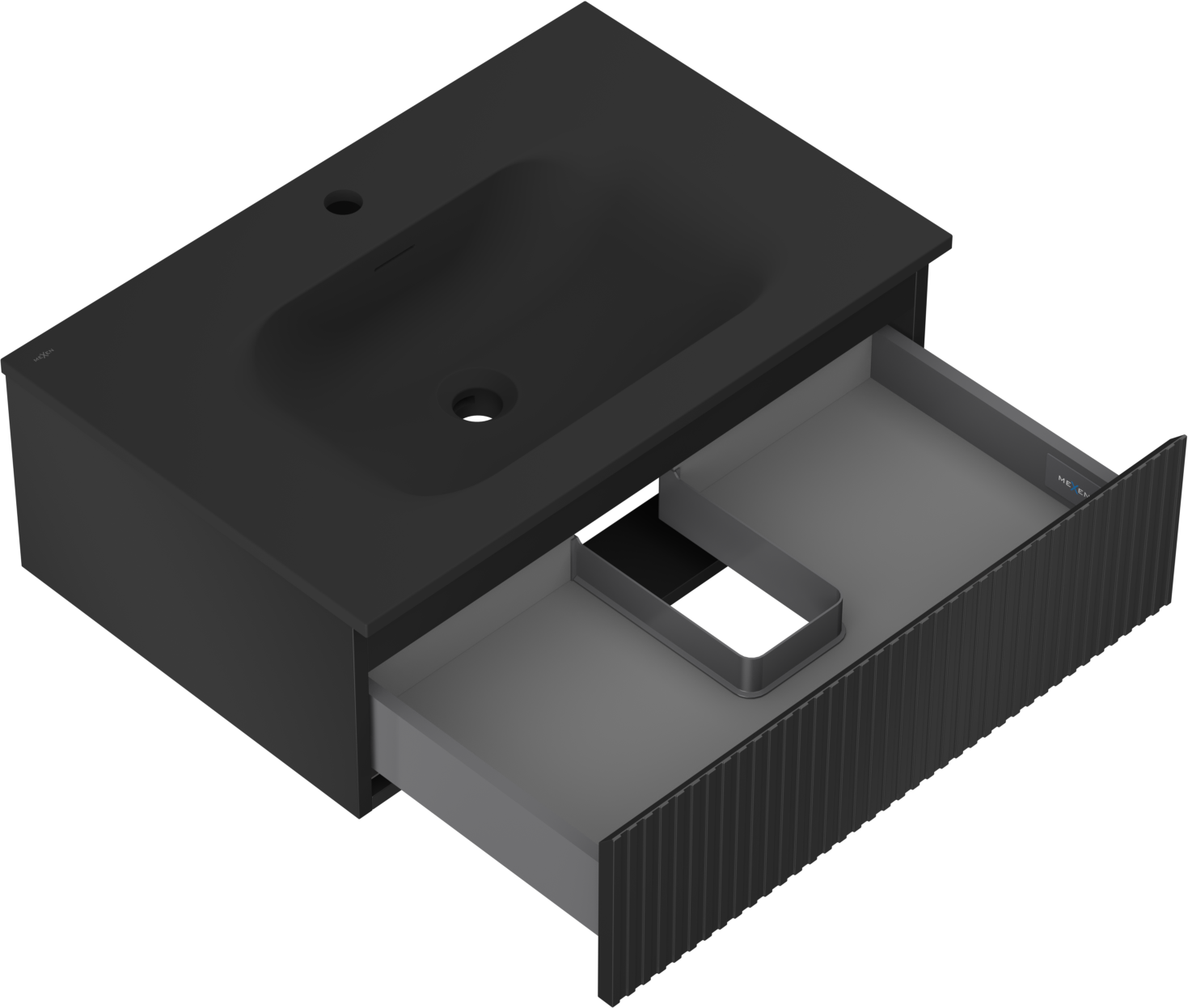 Mexen Rivel 70 cm kylpyhuonekaappi pesualtaalla Vela, 1 laatikko, uurrettu, musta matta - 91A20-07023-1-BF71-W23M71
