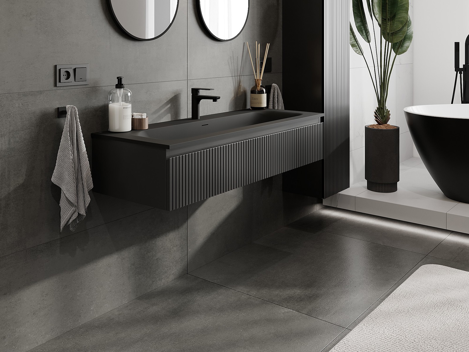 Mexen Rivel kylpyhuonekaappi 120 cm pesualtaalla Vela, 1 laatikko, uurrettu, musta mattapinta - 91A20-12023-1-BF71-W23M71